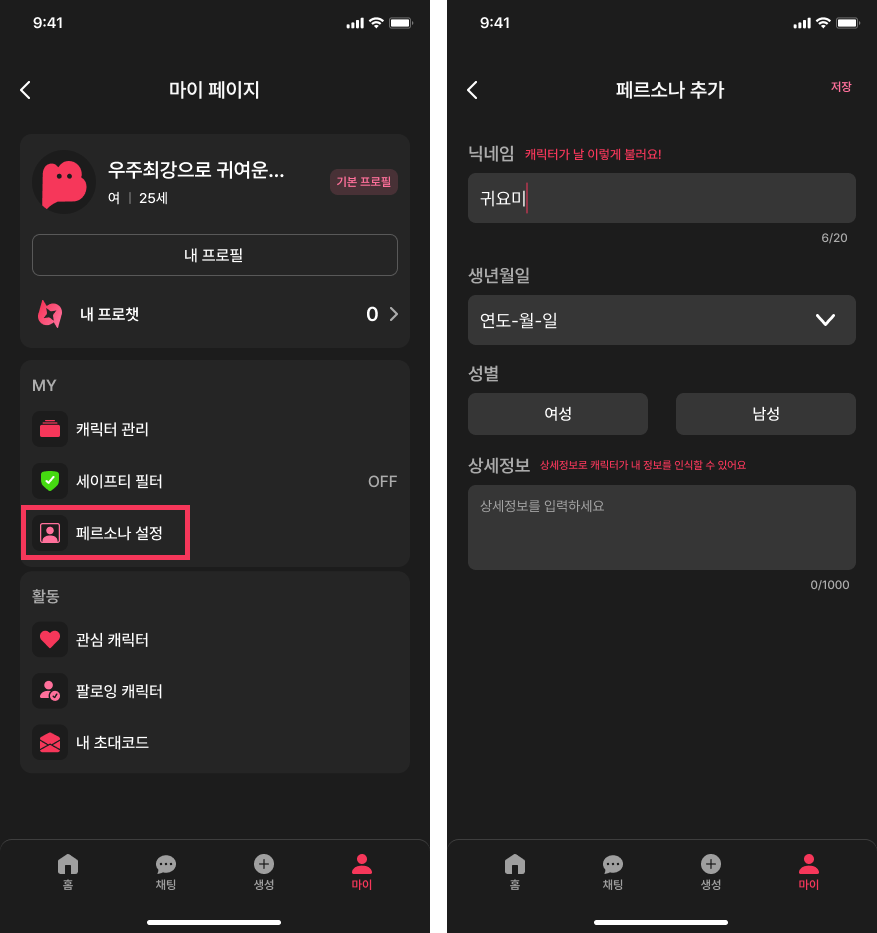 페르소나로 설정한 역할에 맞춰 캐릭터와 대화할 수 있어요.