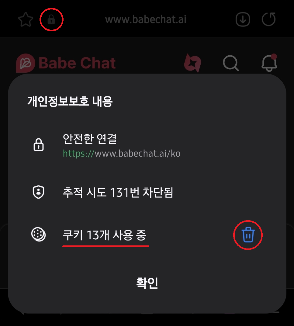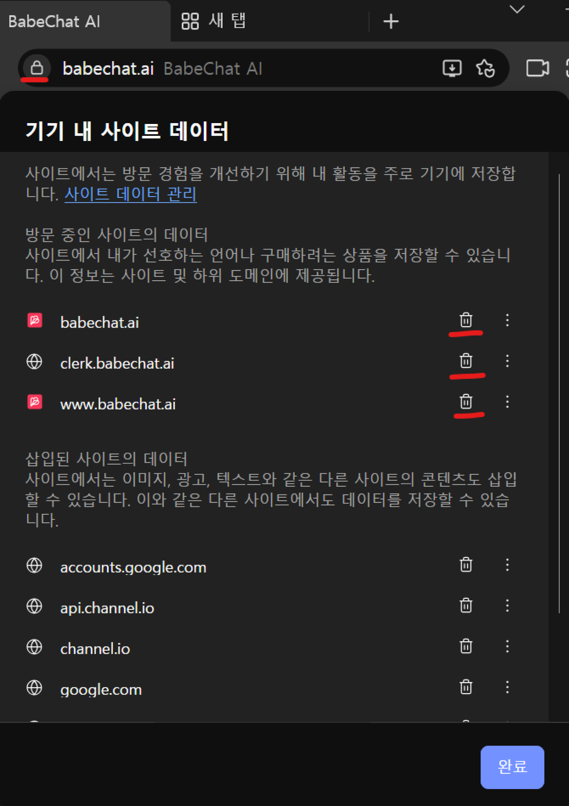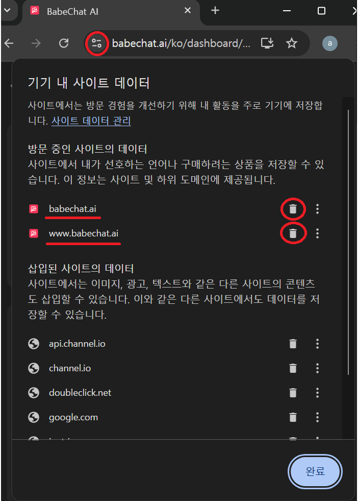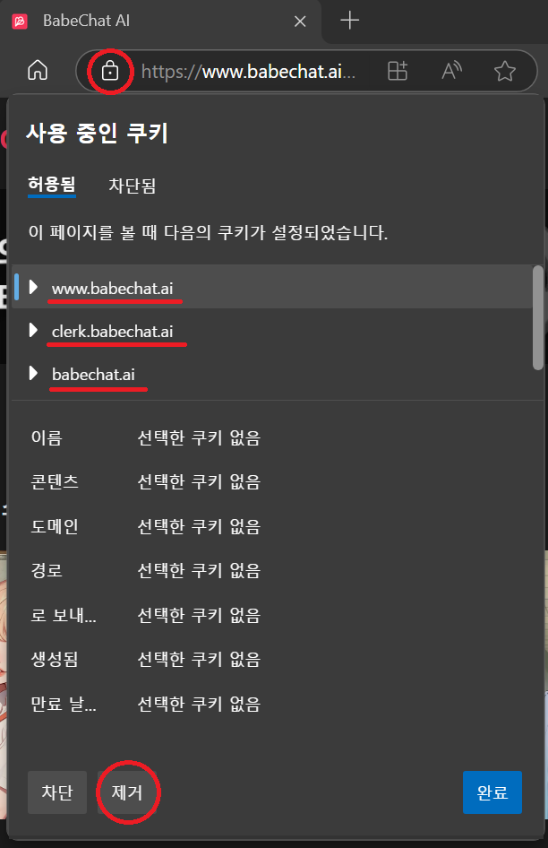 쿠키 및 사이트 데이터 > 쿠키 > 허용됨 > www.babechat.ai, clerk.babechat.ai, babechat.ai 선택 후 제거
