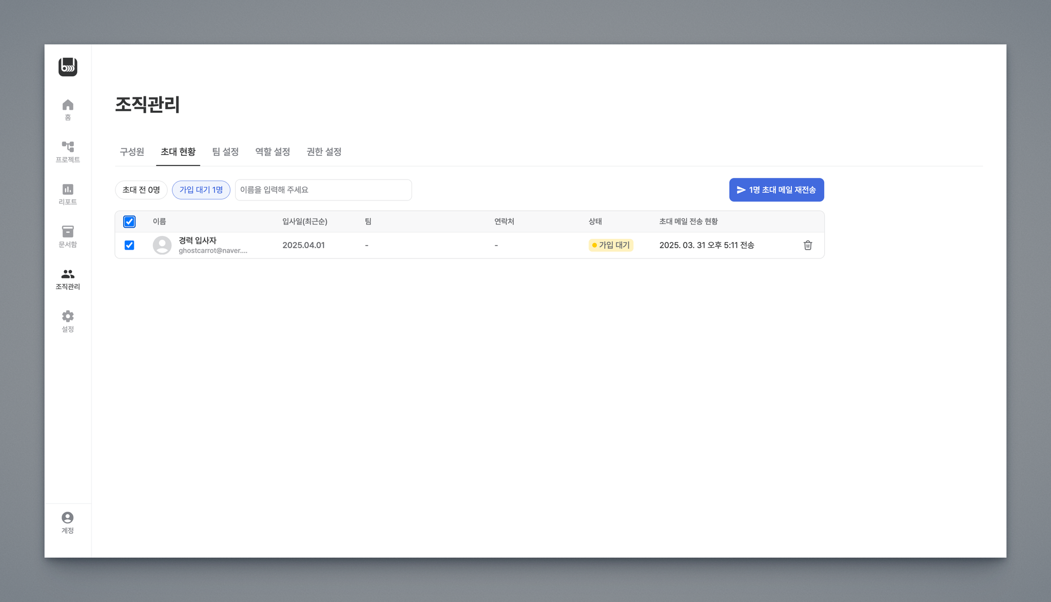 조직관리 > 초대 현황 화면에서 구성원으로 합류하지 않은 임직원을 관리할 수 있습니다.