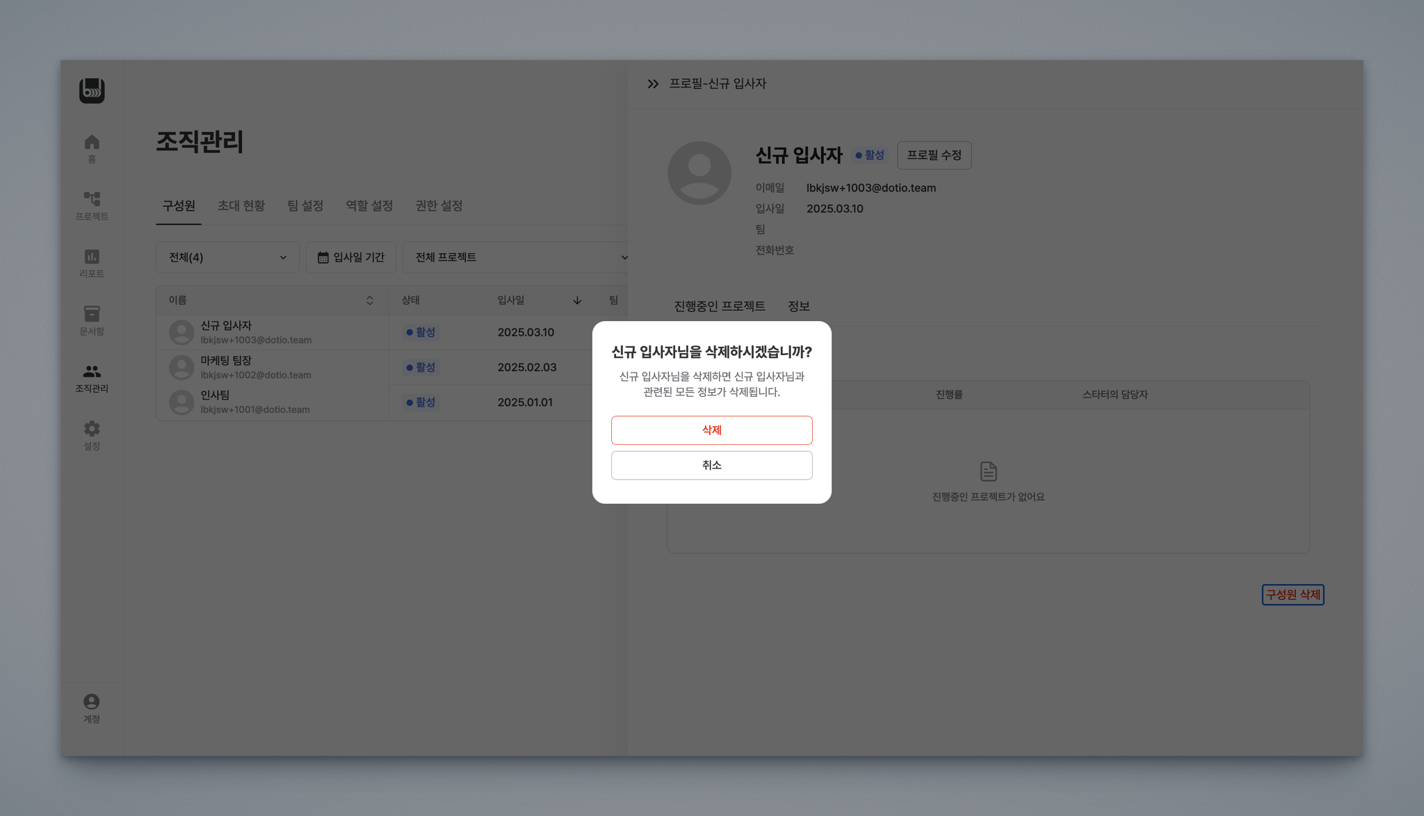 조직관리 > 구성원 화면에서 삭제를 원하는 임직원을 클릭한 후 구성원 상세 화면에서 구성원 삭제 버튼을 클릭합니다.{구성원 이름}님을 삭제하시겠습니까? 창에서 삭제 버튼을 클릭합니다.
