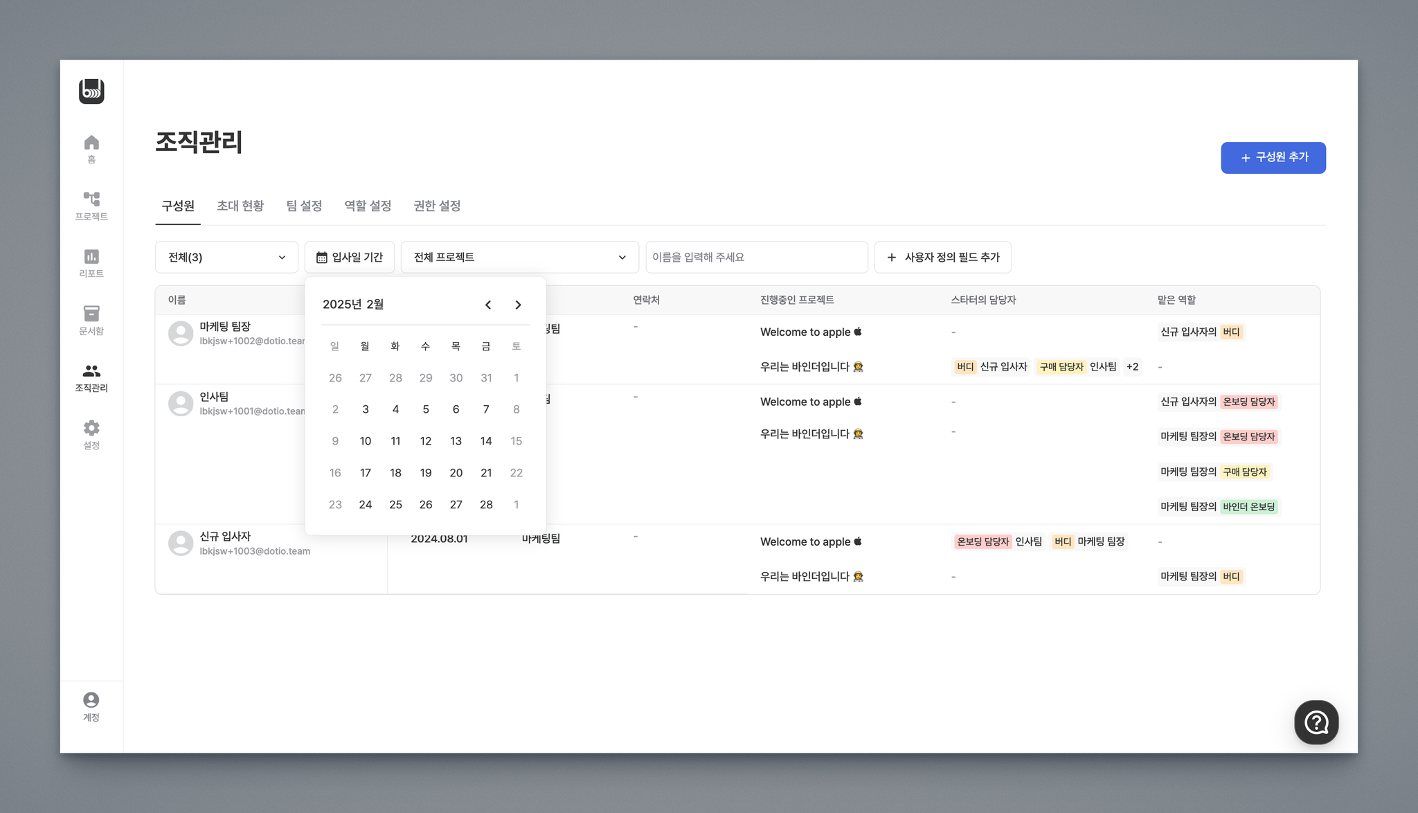 입사일 기간 필터를 통해 특정 기간 내 입사한 임직원만 열람할 수 있습니다.
