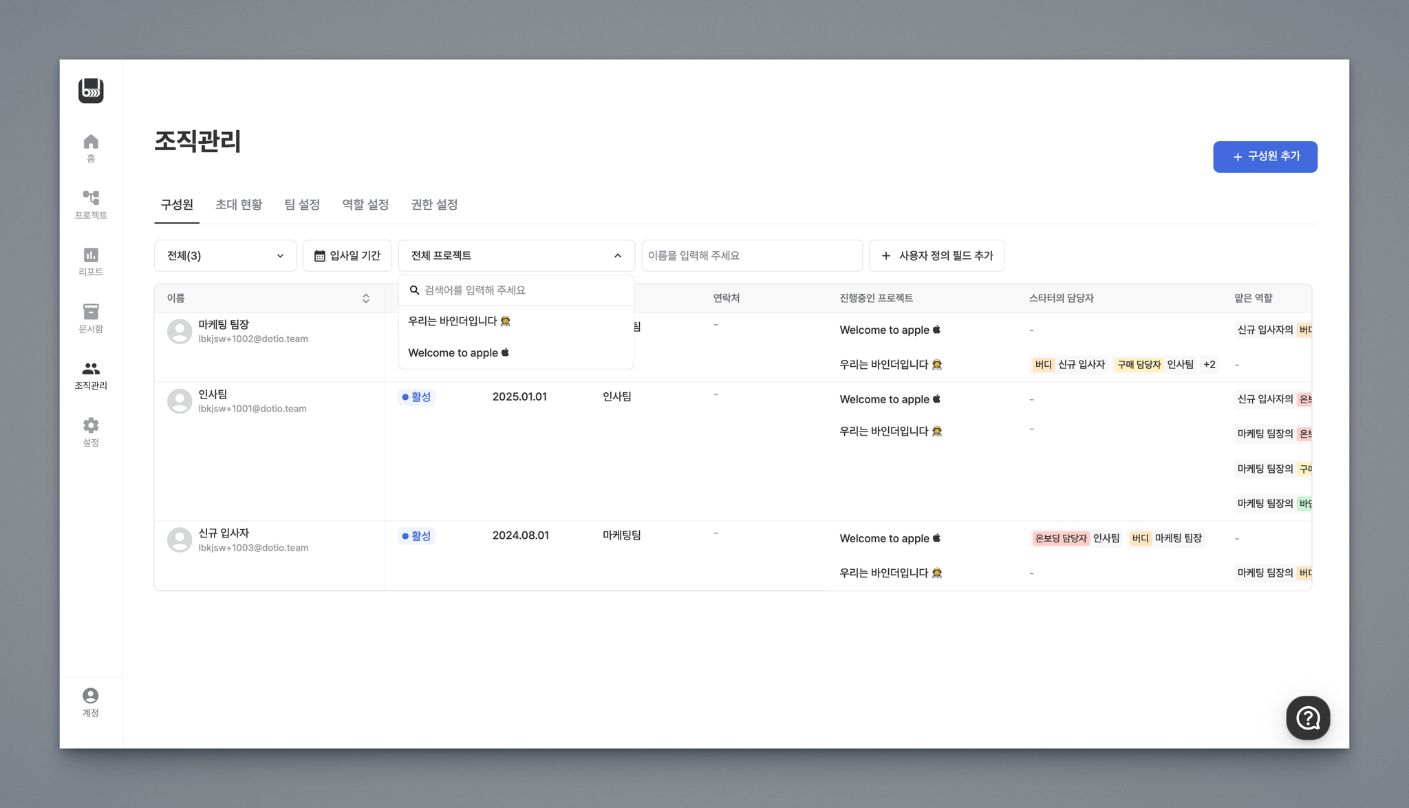 전체 프로젝트 필터를 통해 특정 프로젝트에 참가하고 있는 임직원만 열람할 수 있습니다.