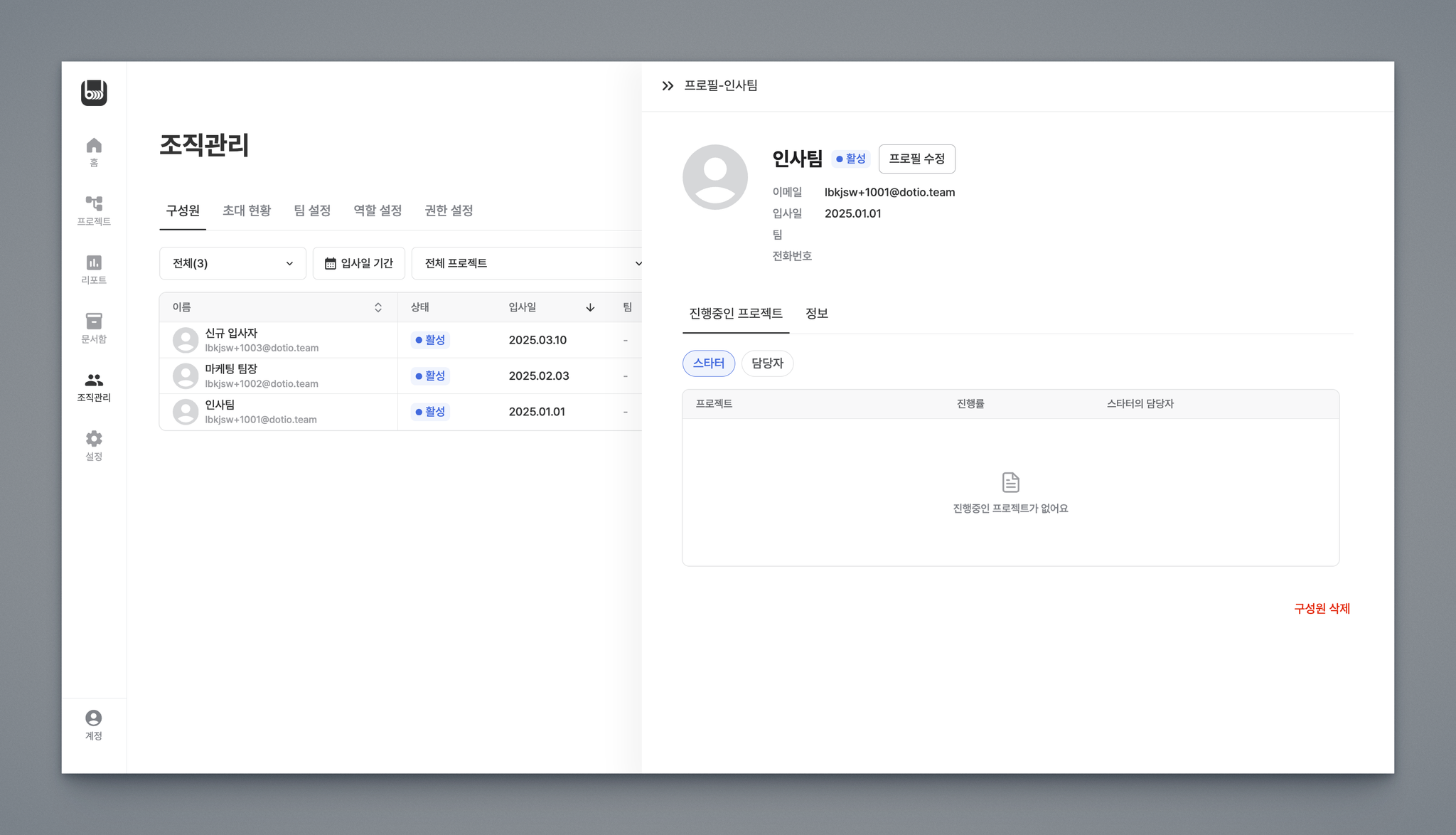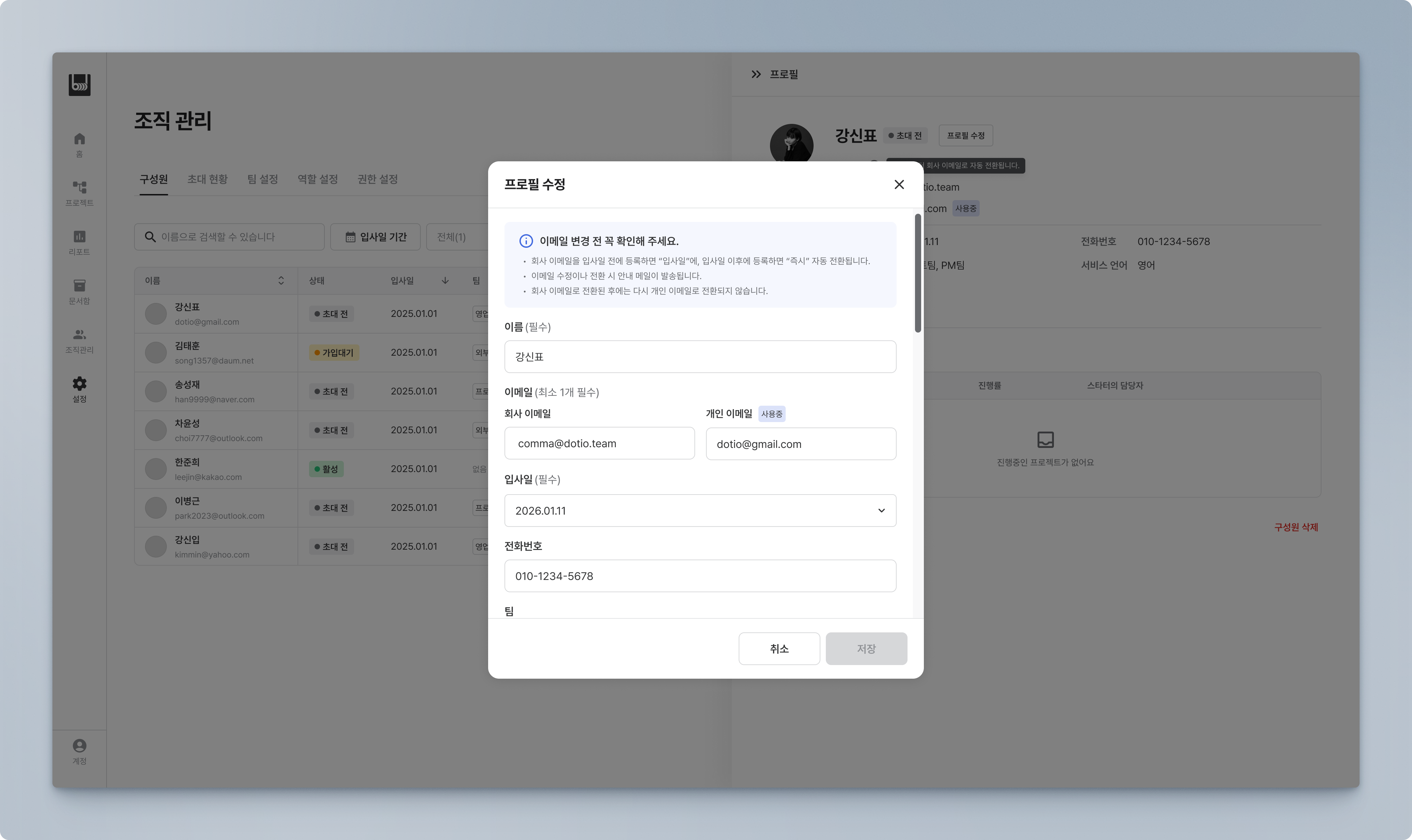 입사일 이후: 회사 이메일은 삭제할 수 없습니다.(회사 이메일이 온보딩의 기준이므로, 수정만 허용)