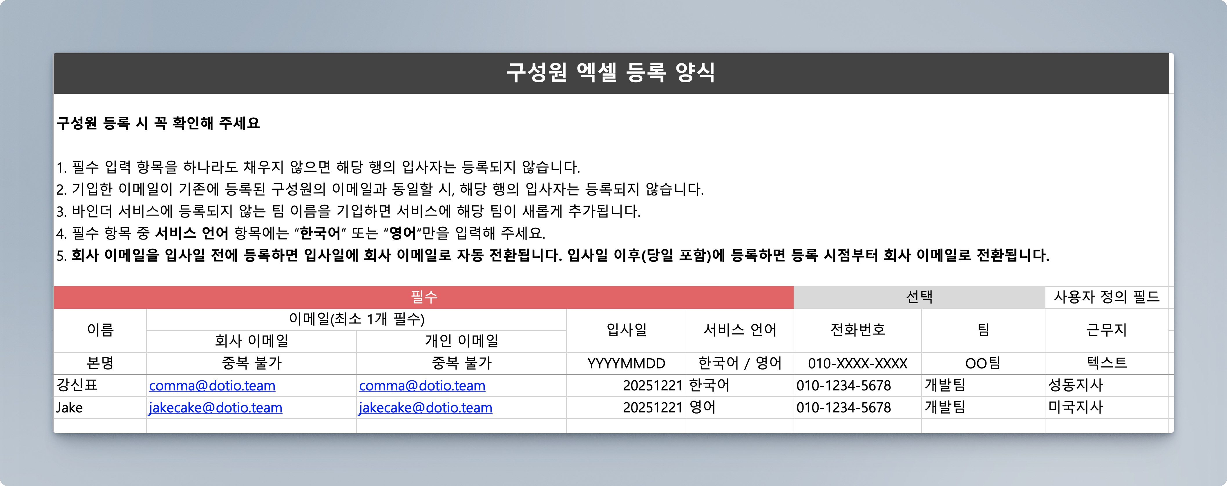 엑셀 서식에 추가를 원하는 구성원 정보를 모두 입력한 후 2. 구성원 정보 등록의 파일 선택 버튼을 눌러 엑셀 파일을 업로드합니다.
