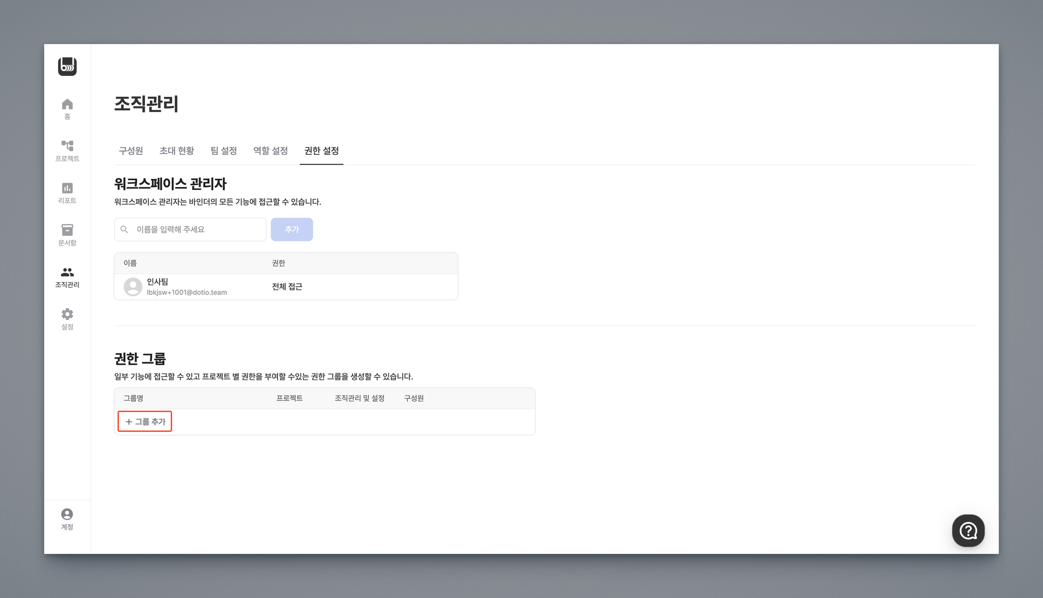 조직관리 > 권한 설정 화면에서 + 그룹 추가 버튼을 클릭합니다.