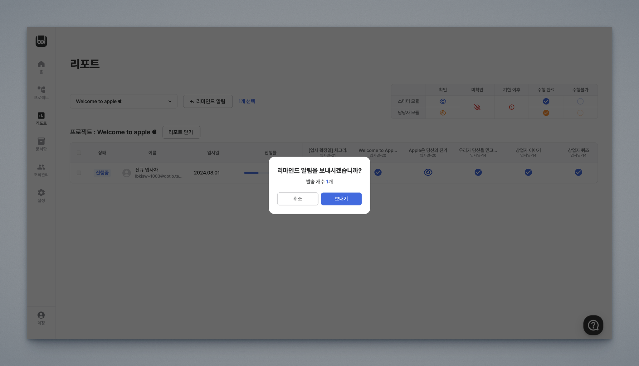 리마인드 알림을 보내시겠습니까? 창에서 보내기 버튼을 클릭합니다.
