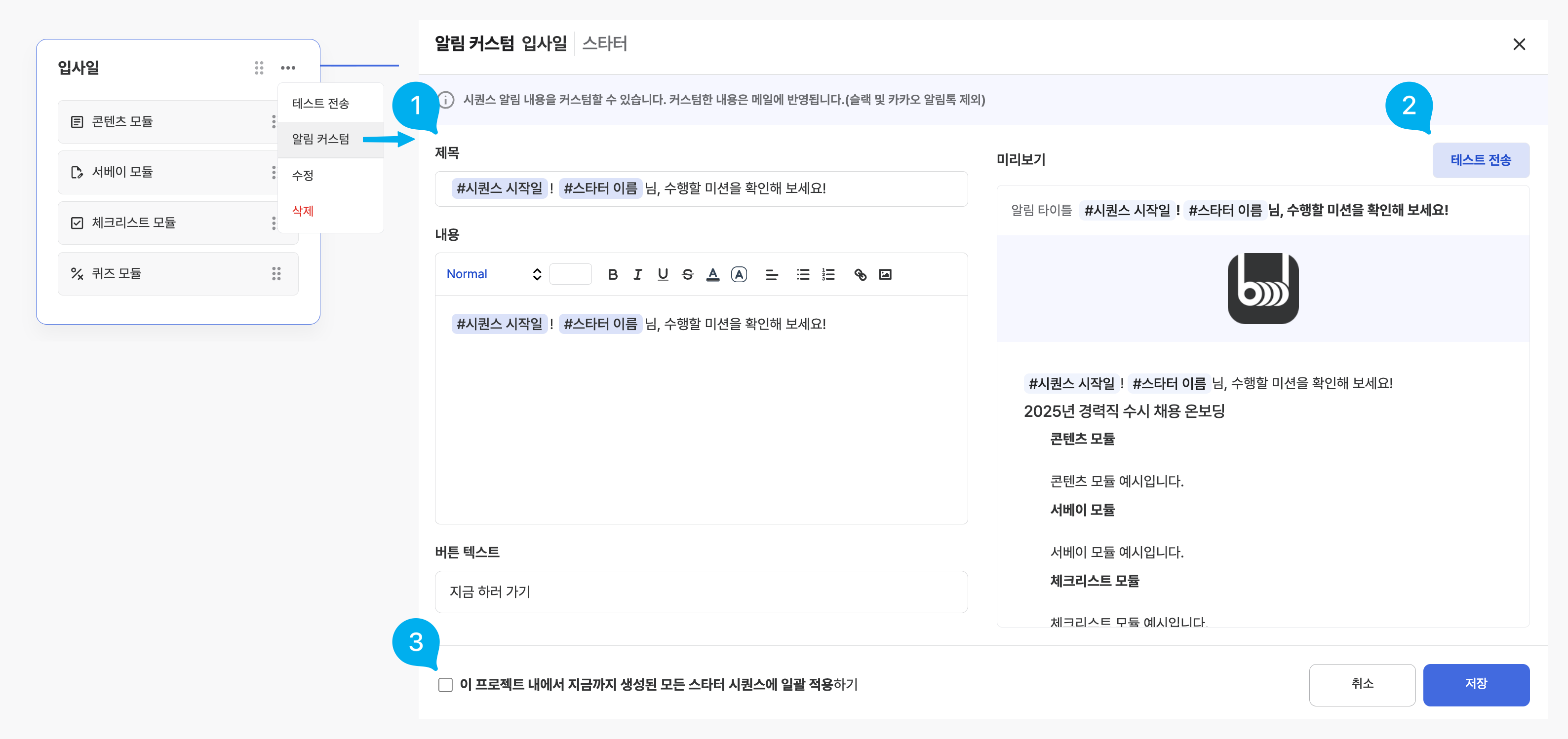 3️⃣ 커스텀한 내용은 현재 프로젝트 내의 모든 (스타터 or 담당자) 시퀀스에 한 번에 적용할 수 있습니다.