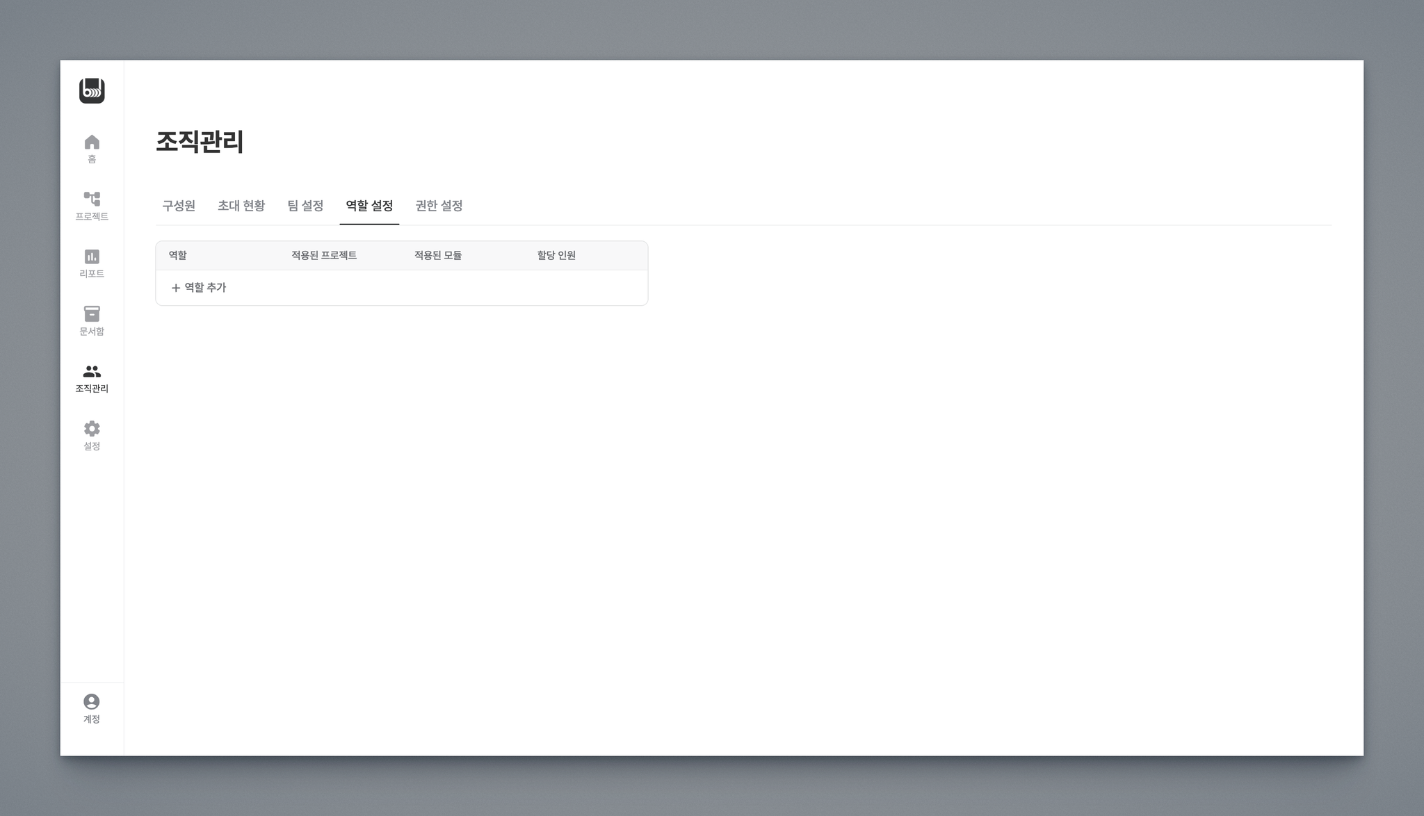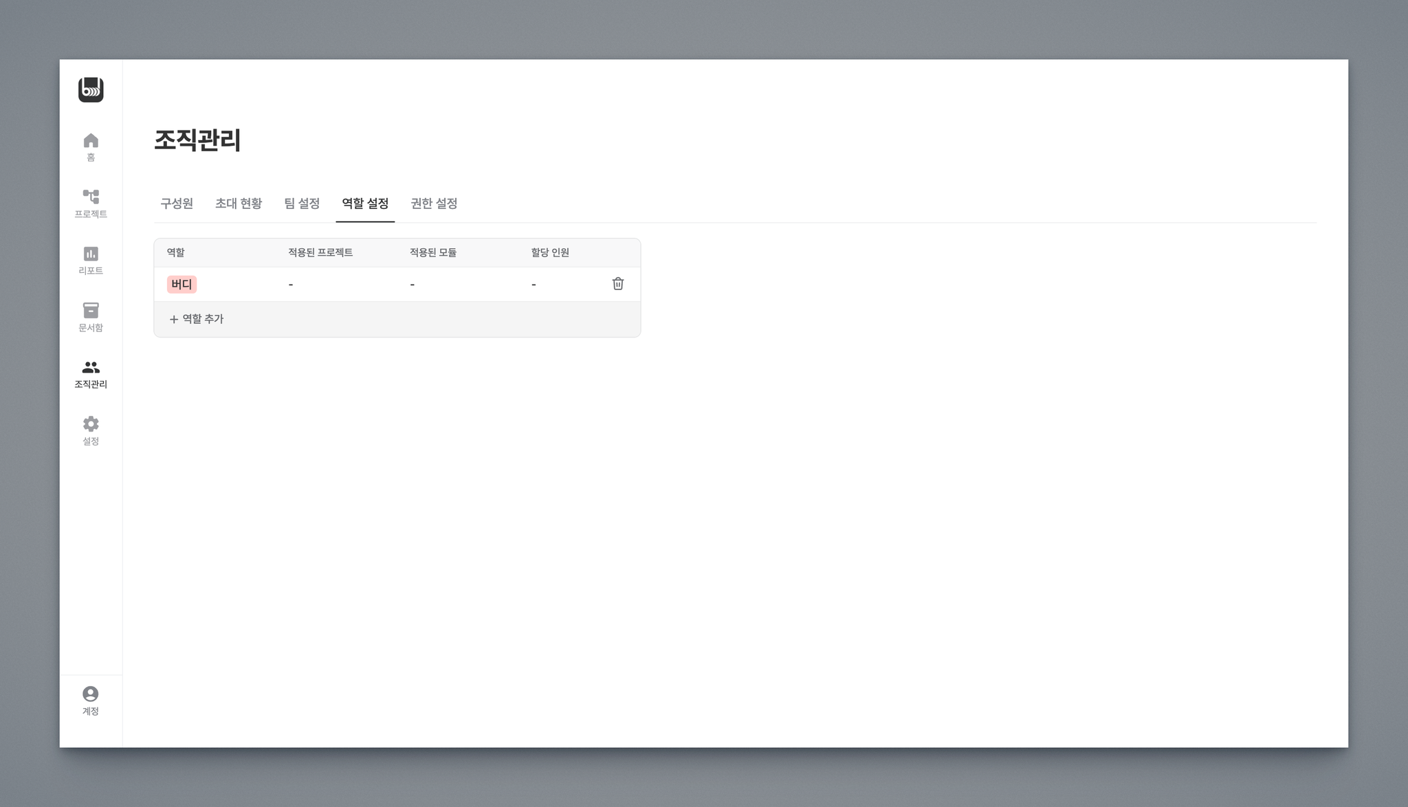 조직관리 > 역할 설정 화면에서 역할을 생성할 수 있습니다. + 역할 추가 버튼을 클릭합니다.