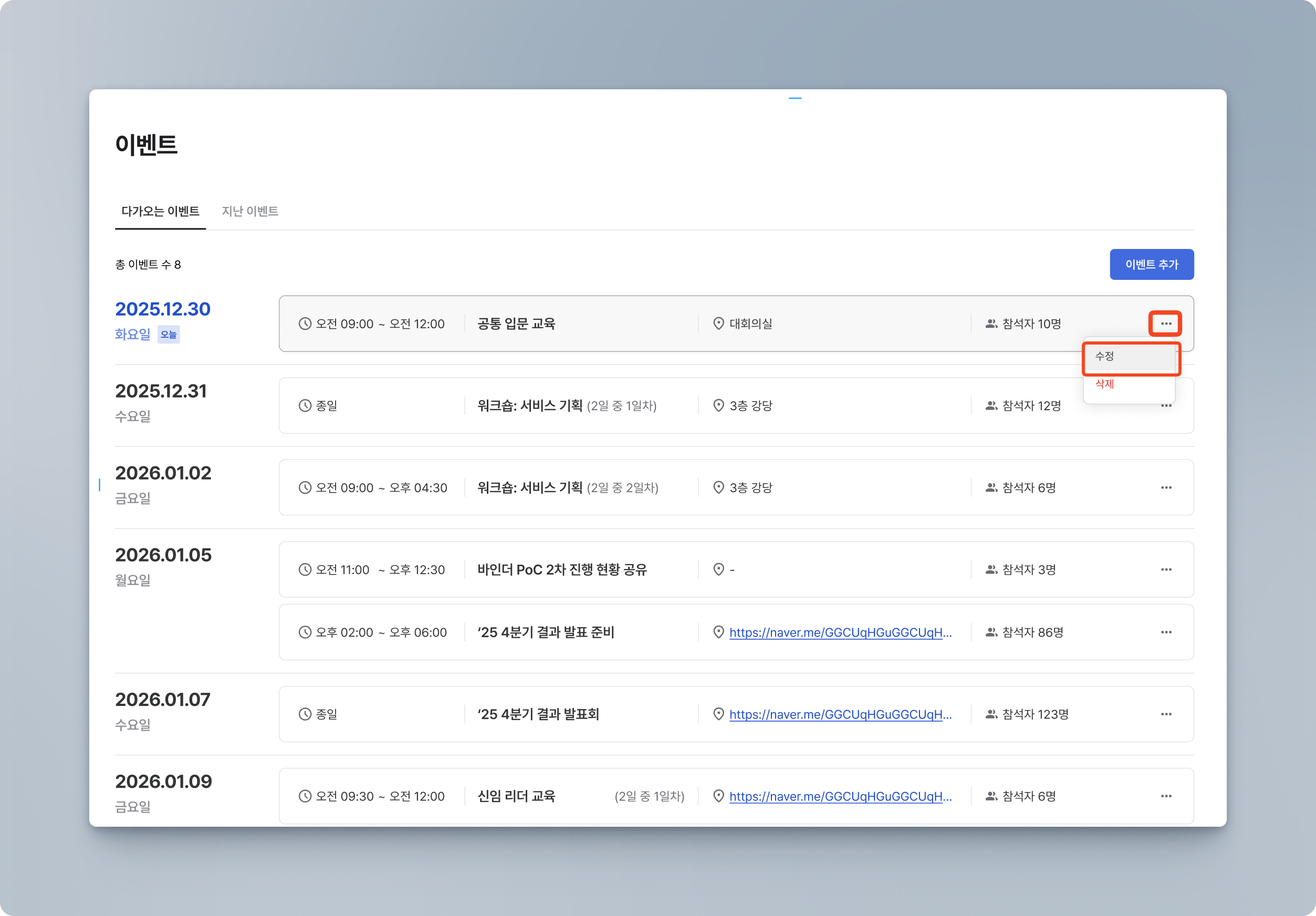 수정하고자 하는 이벤트의 우측 점(•••)을 클릭 후 수정 버튼을 클릭합니다.