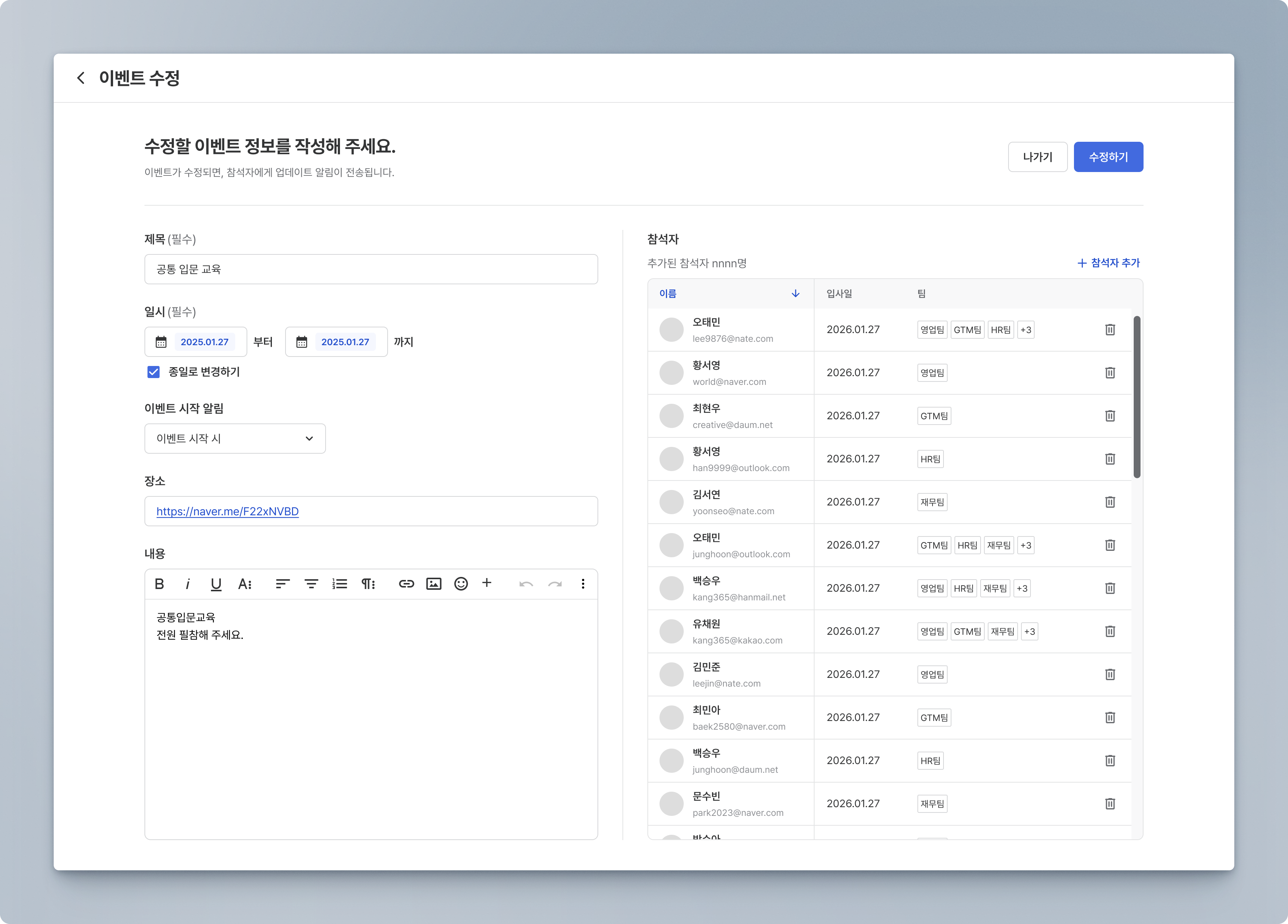 이벤트가 수정되면 참석자에게 이벤트 수정 알림이 전송됩니다.