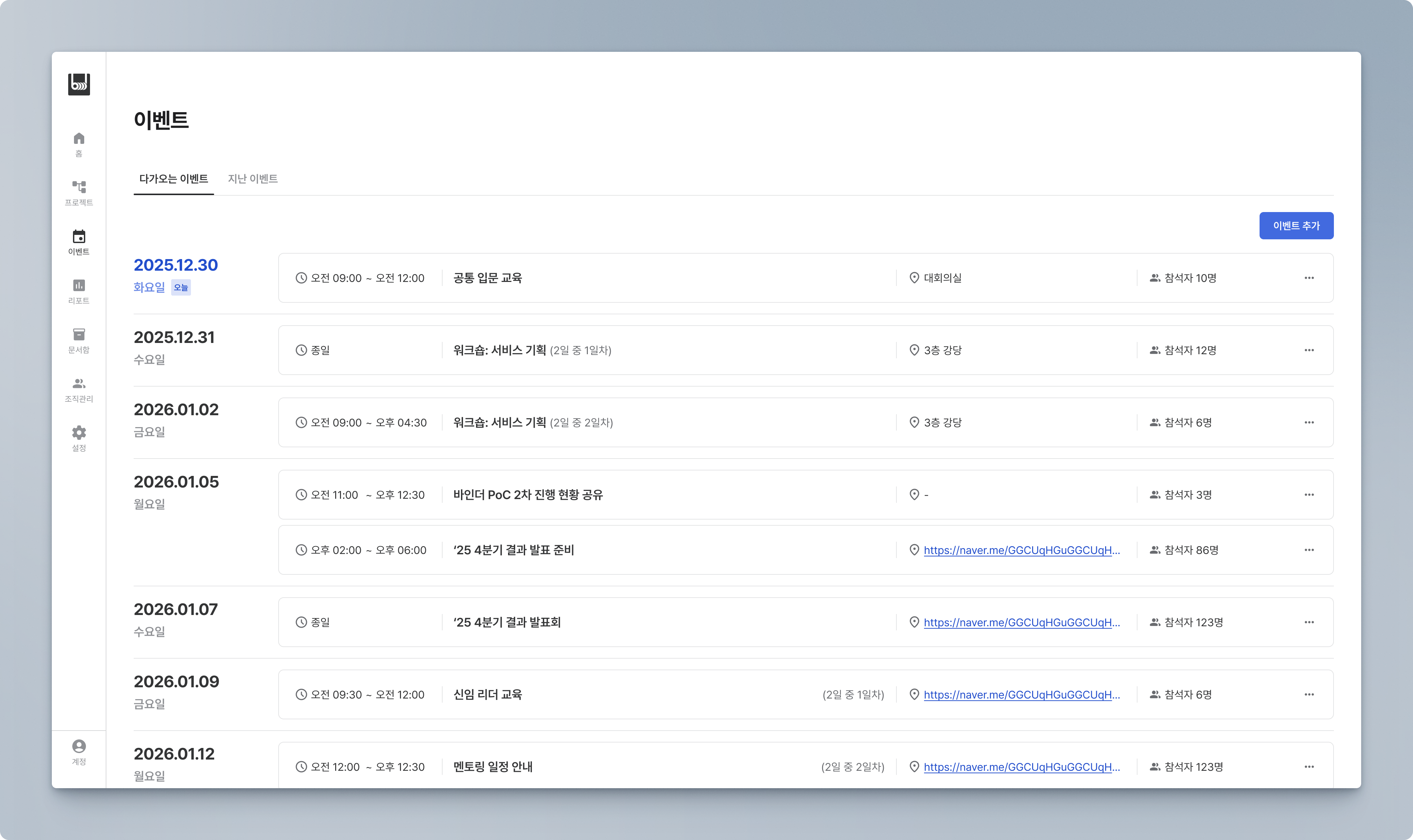입사일 기준이 아니라, 원하는 대상 또는 그룹에게 동일한 날짜에 진행되는 이벤트를 생성하고 수정 등 관리할 수 있는 페이지 입니다.