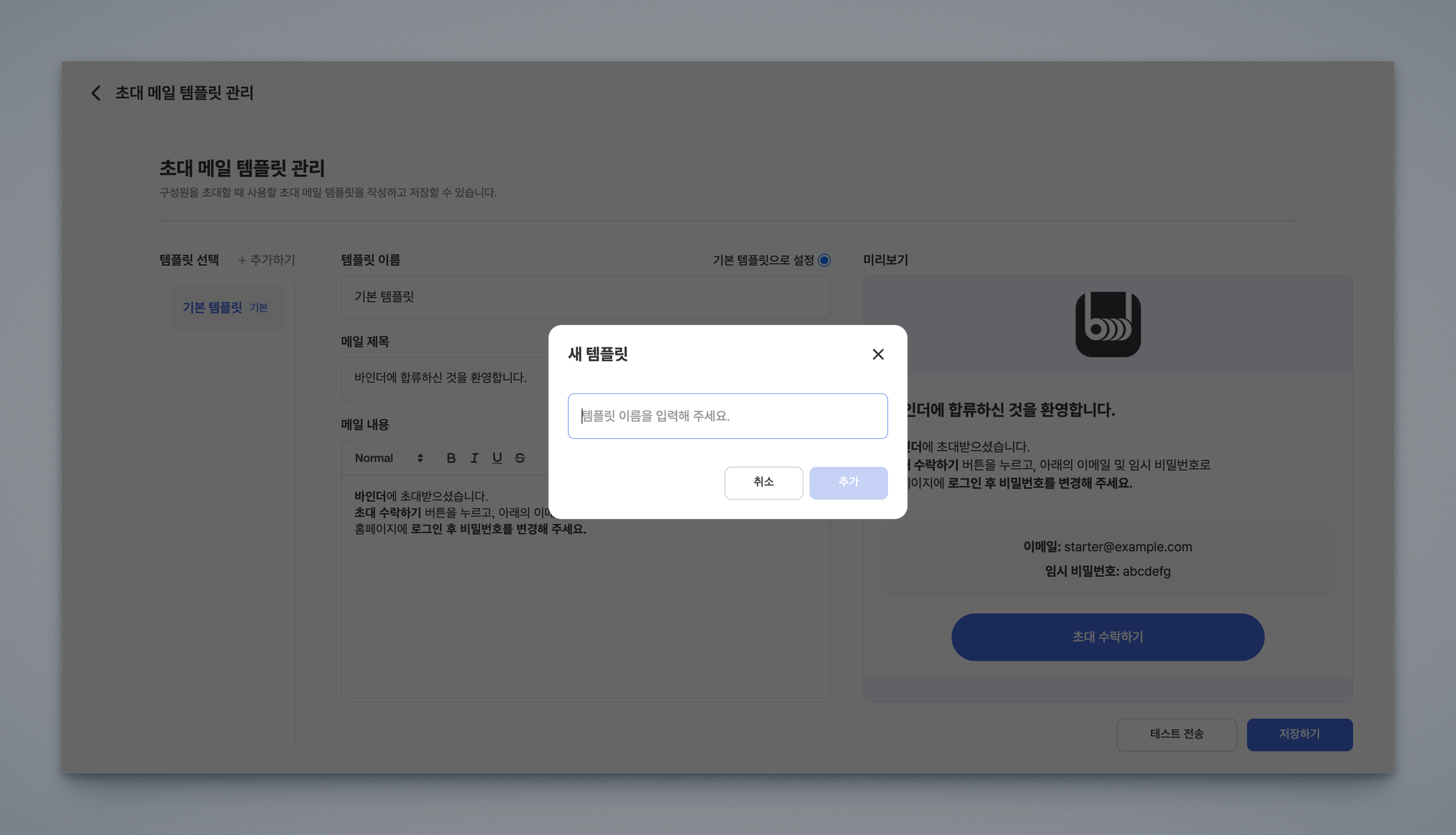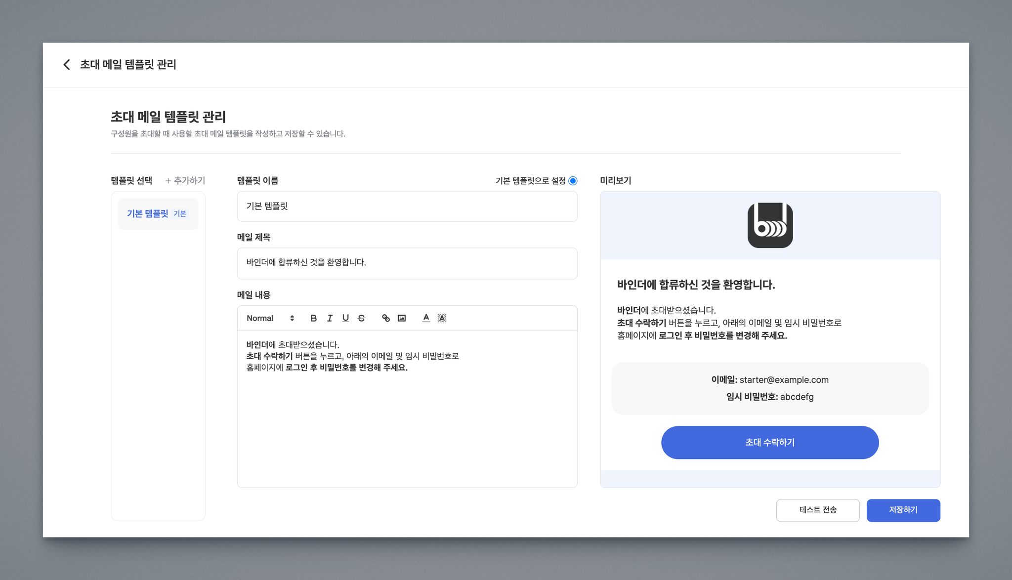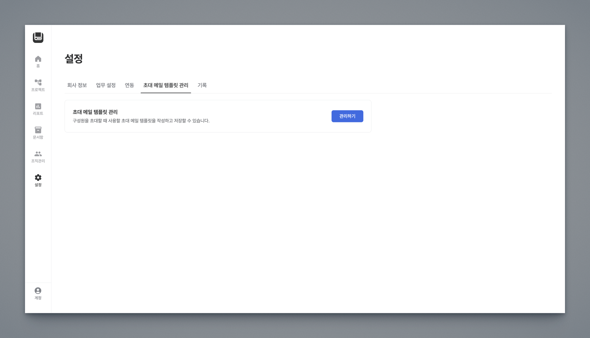 설정 > 초대 메일 템플릿 관리 화면에서 관리하기 버튼을 클릭합니다.