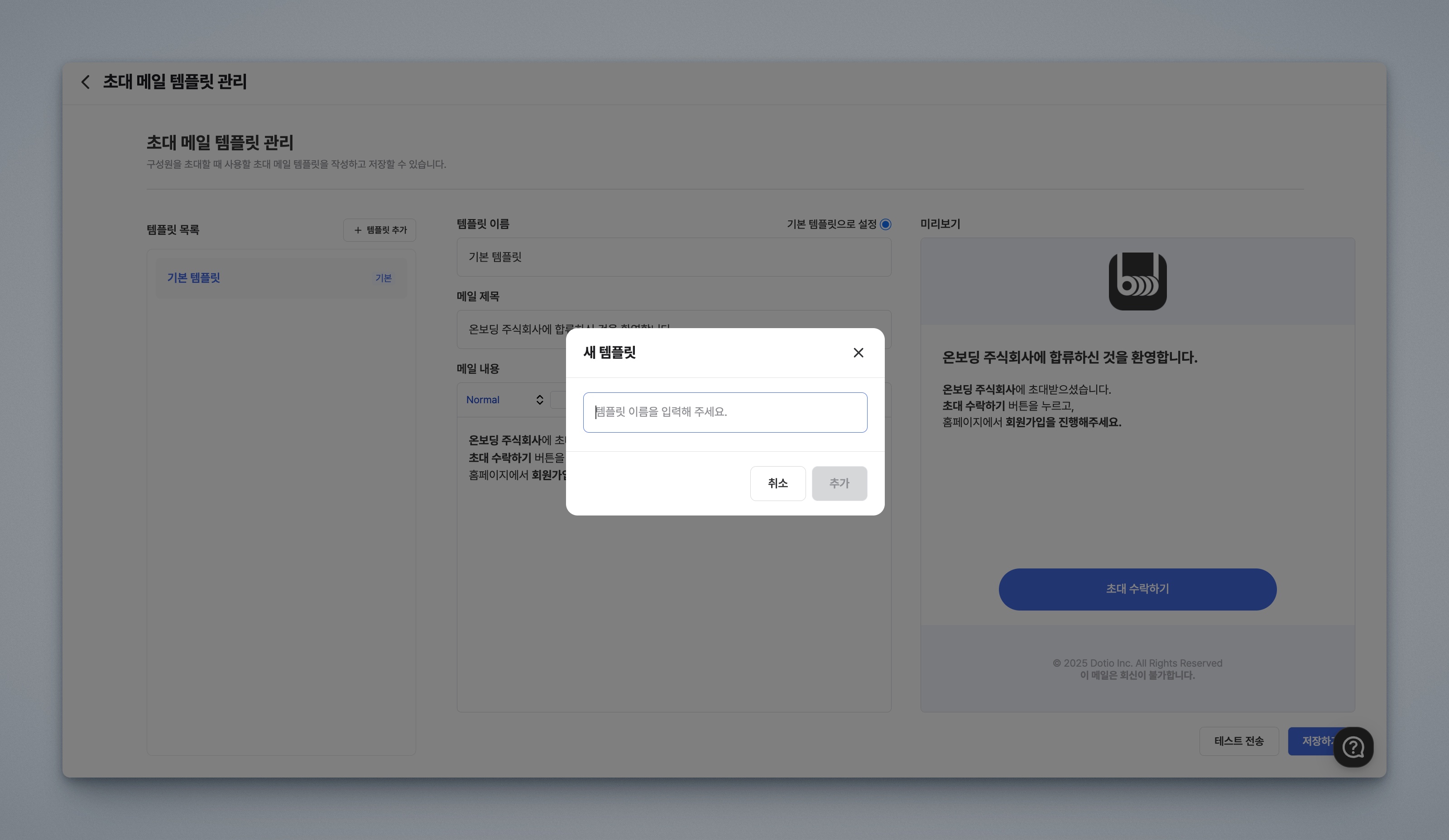 초대 메일 전송 화면에서 원하는 메일 제목과 내용을 수정한 후 + 작성한 내용 템플릿으로 저장 버튼을 클릭합니다.새 템플릿 화면에서 템플릿 제목을 입력한 후 추가 버튼을 클릭합니다.