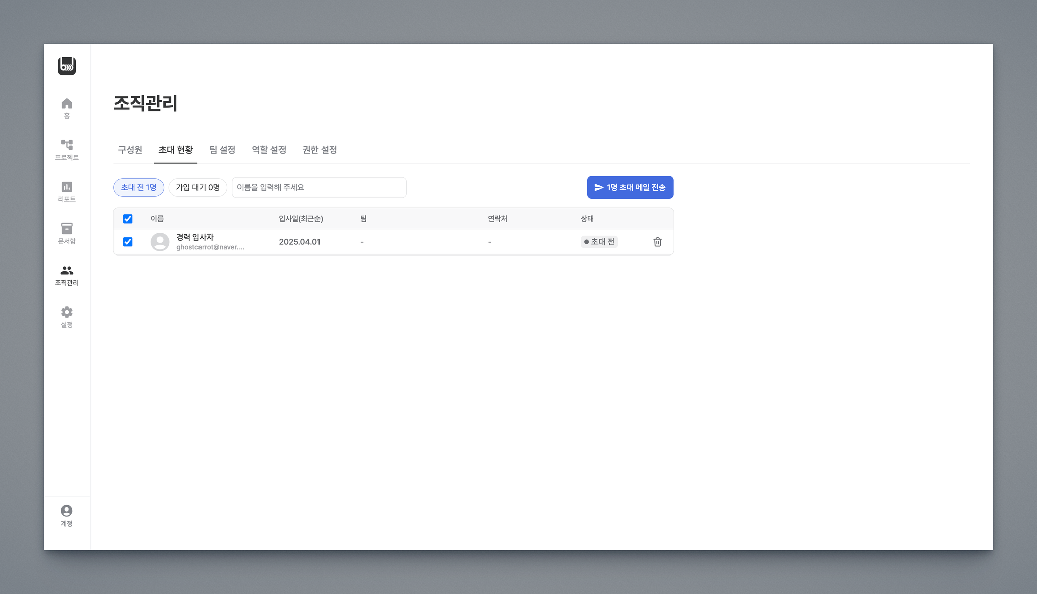 조직관리 > 초대 현황 화면에서 구성원으로 합류하지 않은 임직원을 관리할 수 있습니다.