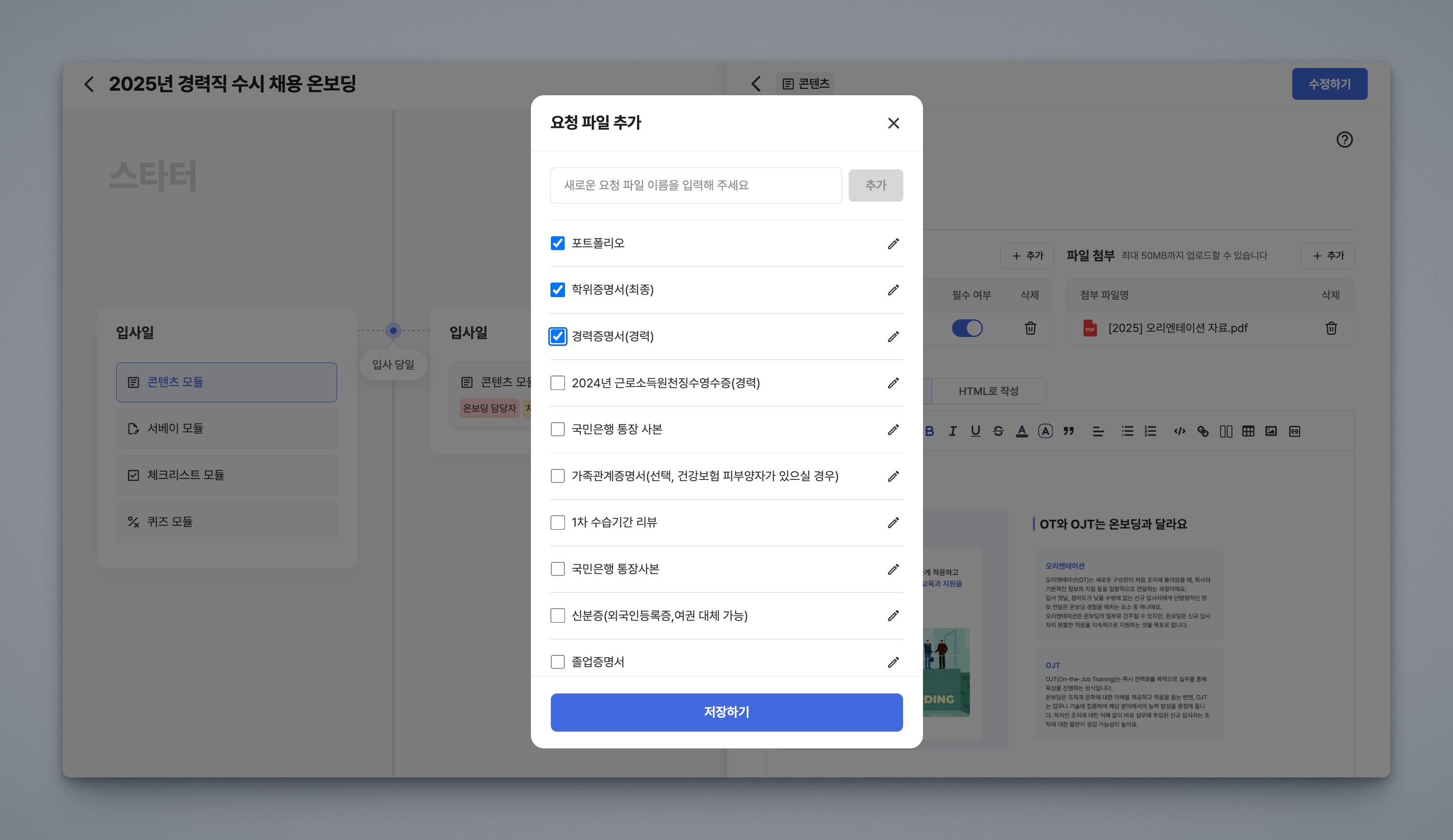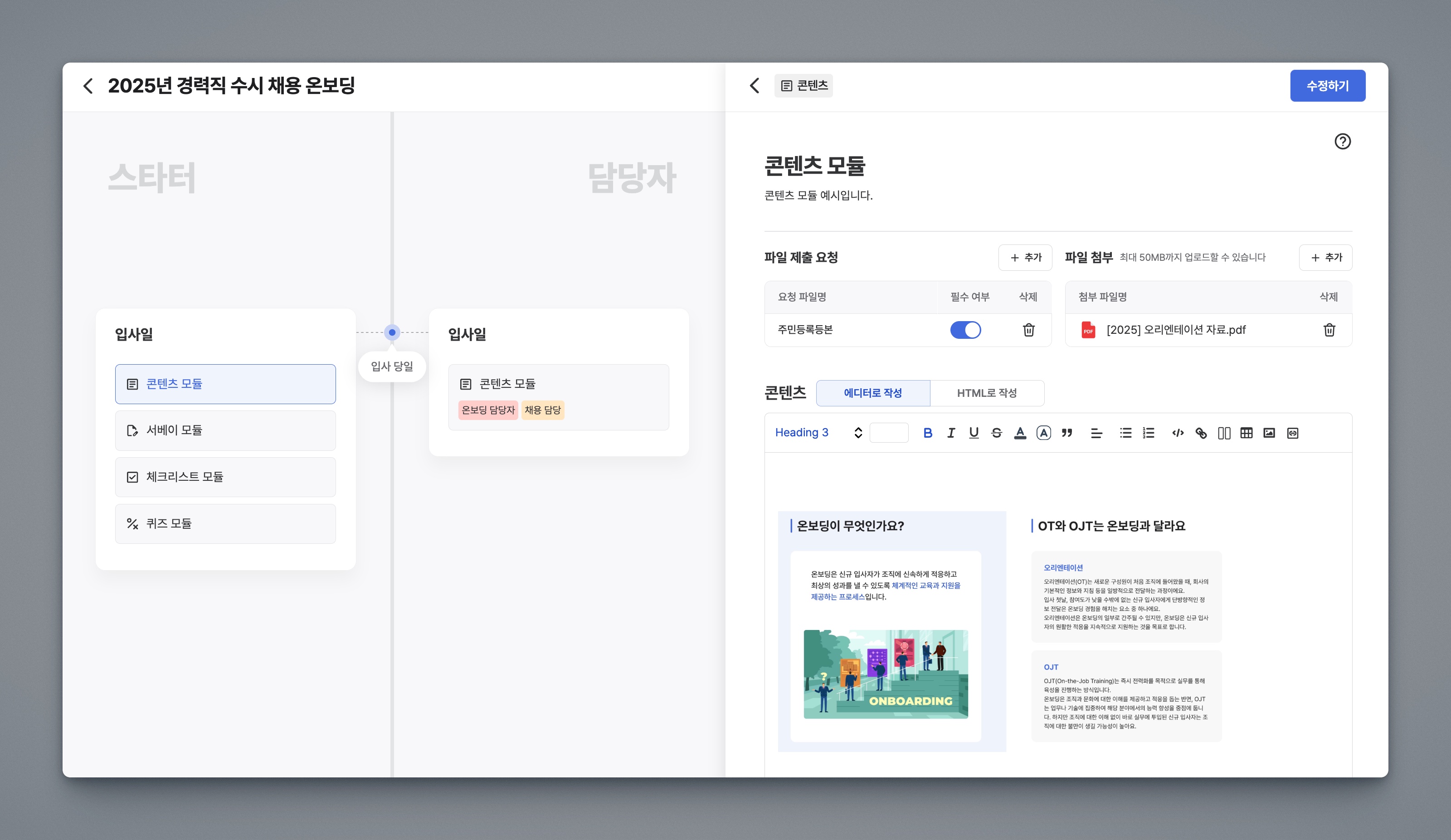 콘텐츠 에디터 화면이 우측에 표시됩니다. 콘텐츠 모듈은 파일을 주고 받을 수 있는 기능이 있습니다.