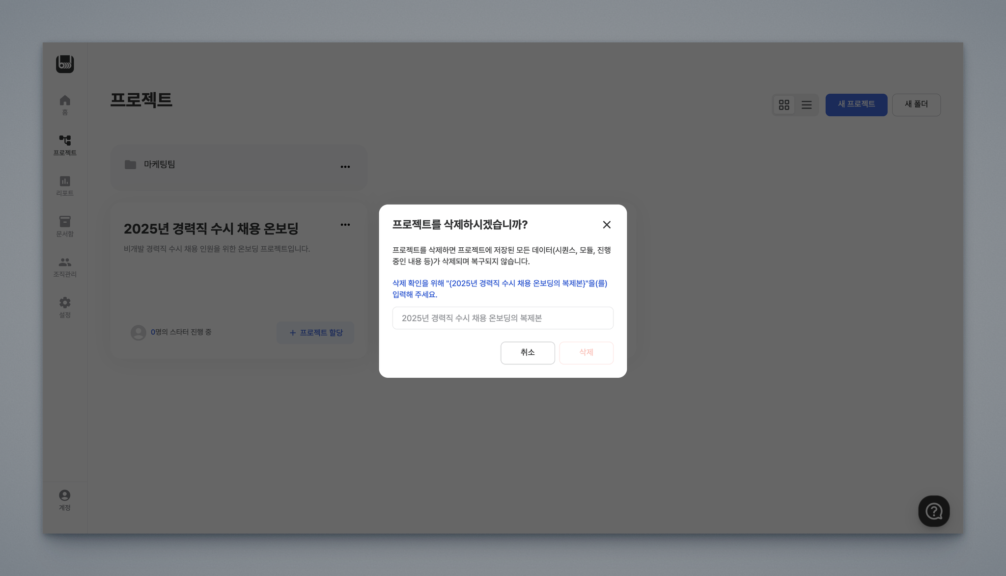 프로젝트를 삭제하시겠습니까? 창에서 삭제를 원하는 프로젝트의 이름을 똑같이 입력하신 후 삭제 버튼을 클릭합니다.