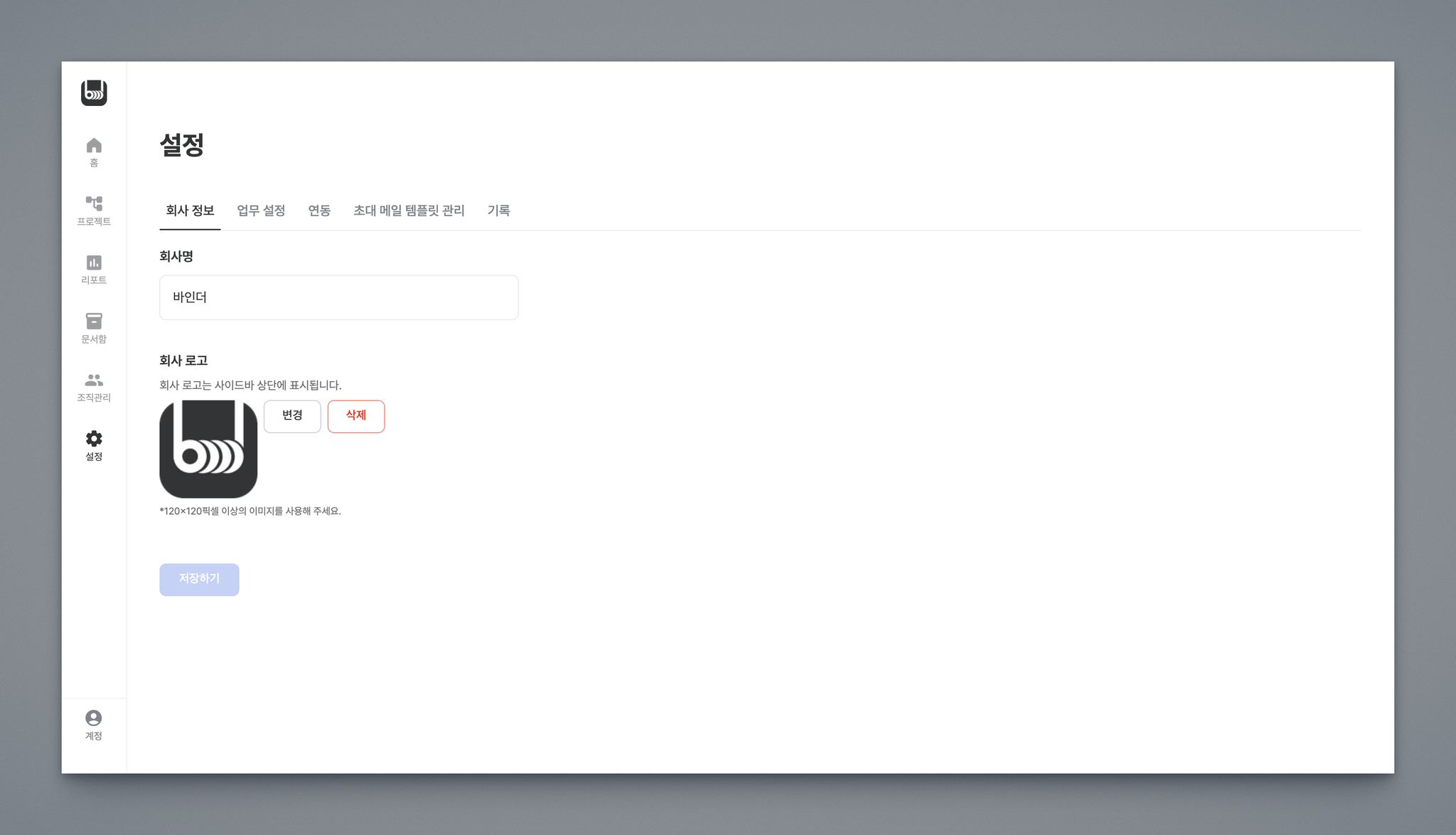 회사명은 스타터와 담당자에게 발송되는 메일이나 모듈의 변수 사용을 위해 입력해야 하는 정보입니다.