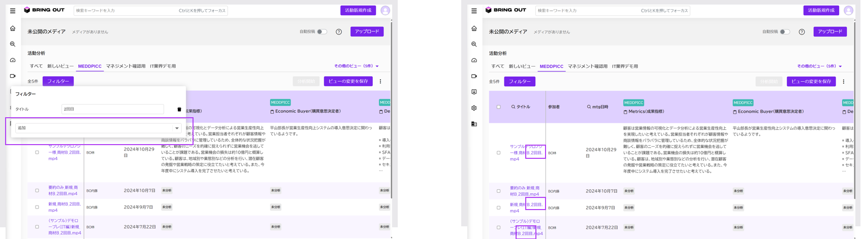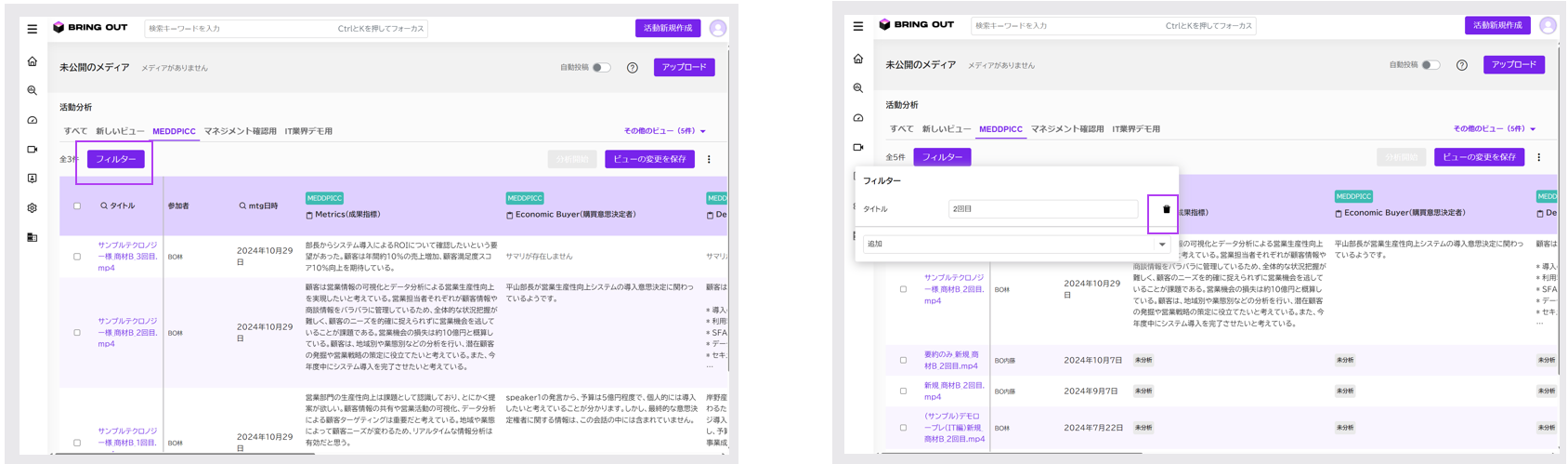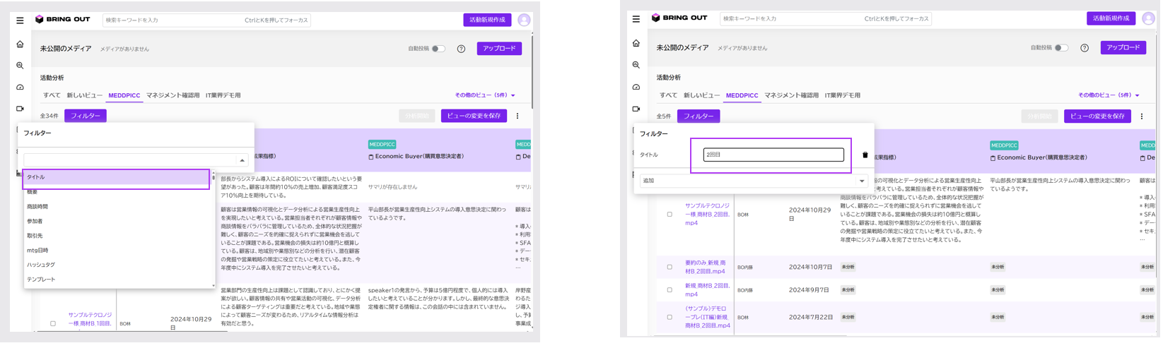 例えば、”商談に参加した参加者” や ”ある解析項目に絞った投稿だけ” などを表示したい場合などに使用します。