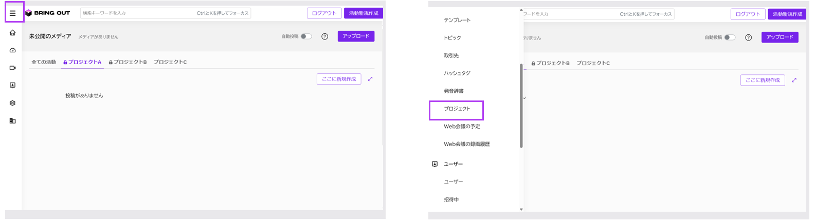 画面左側の「≡メニュー」から「プロジェクト」を選択します。