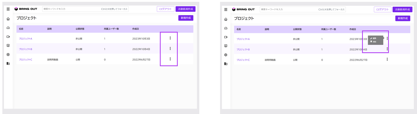 編集したいプロジェクトの右側にある、「︙マーク」をクリックし、「削除」を選択してください。