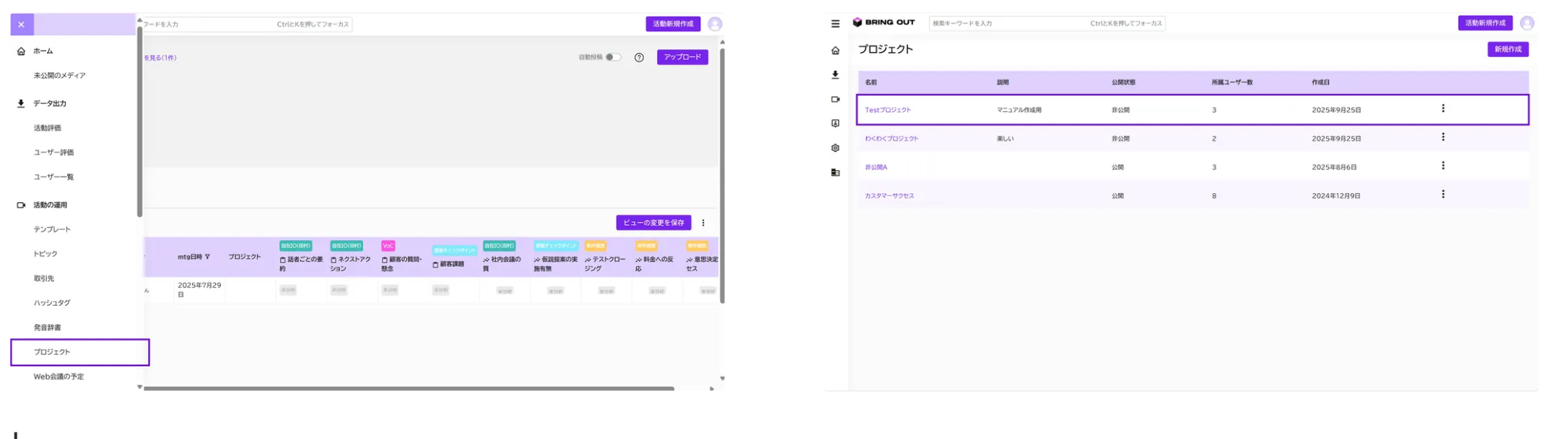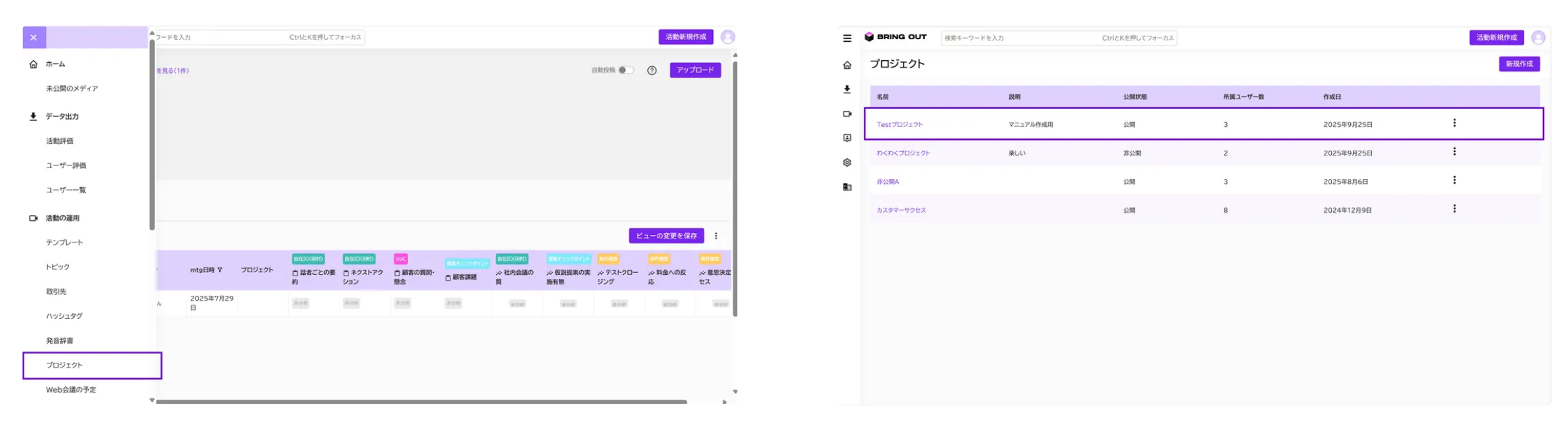 TOP画面左の「≡メニュー」から「プロジェクト」を選択し、変更したいプロジェクトの「︙マーク」をクリックし「編集」をクリックします。