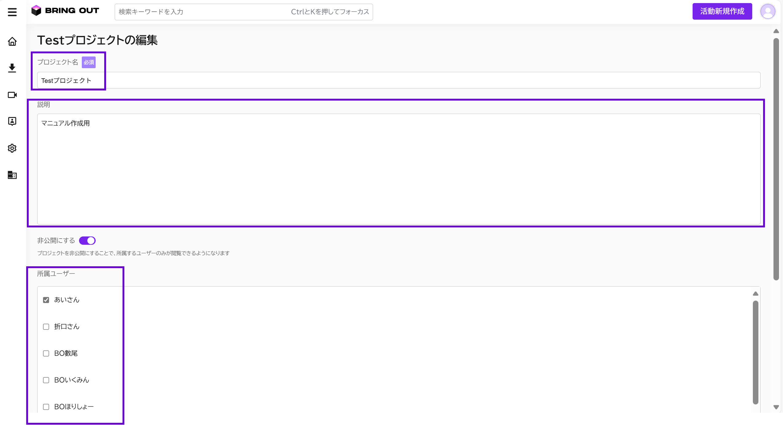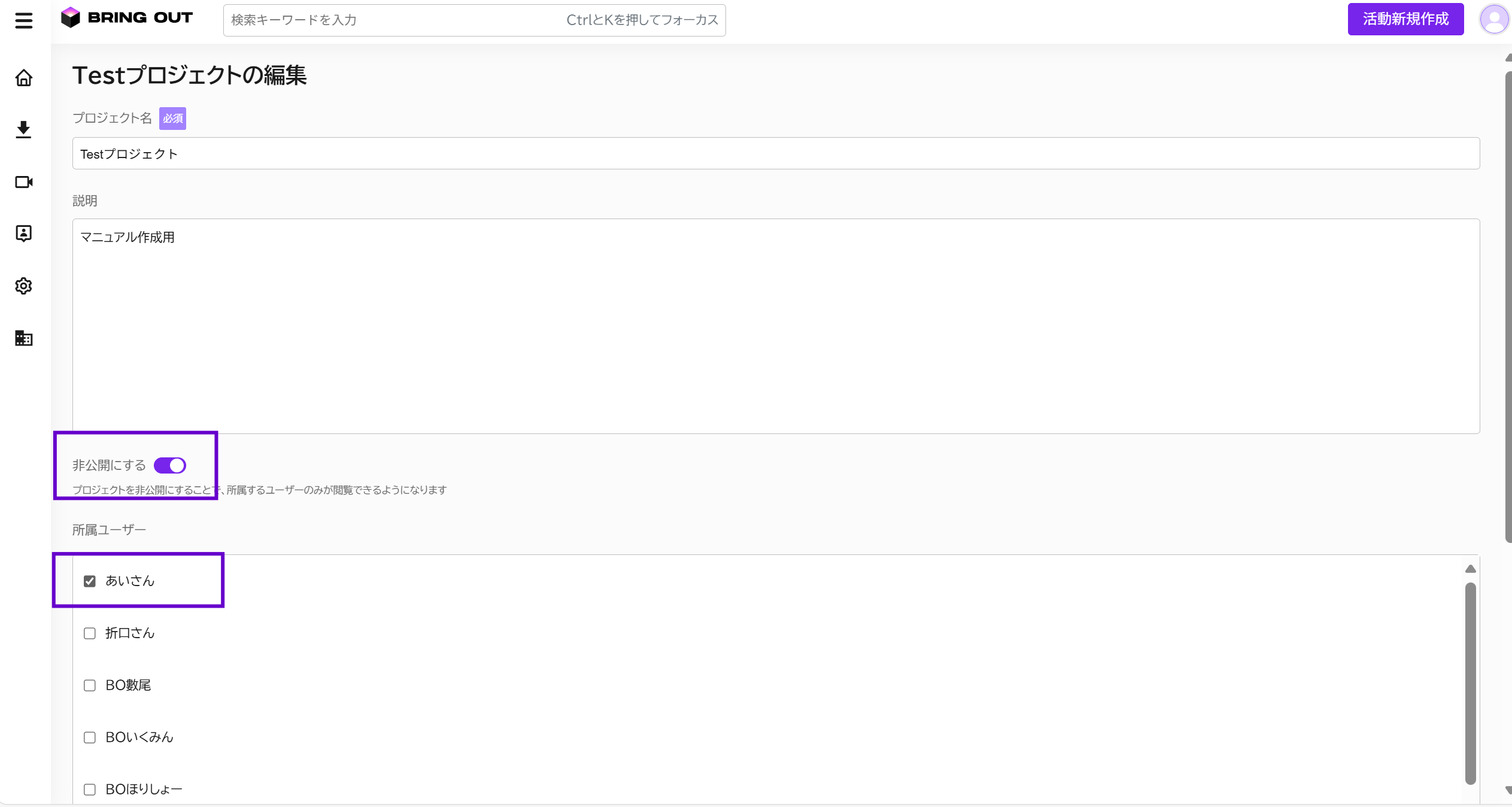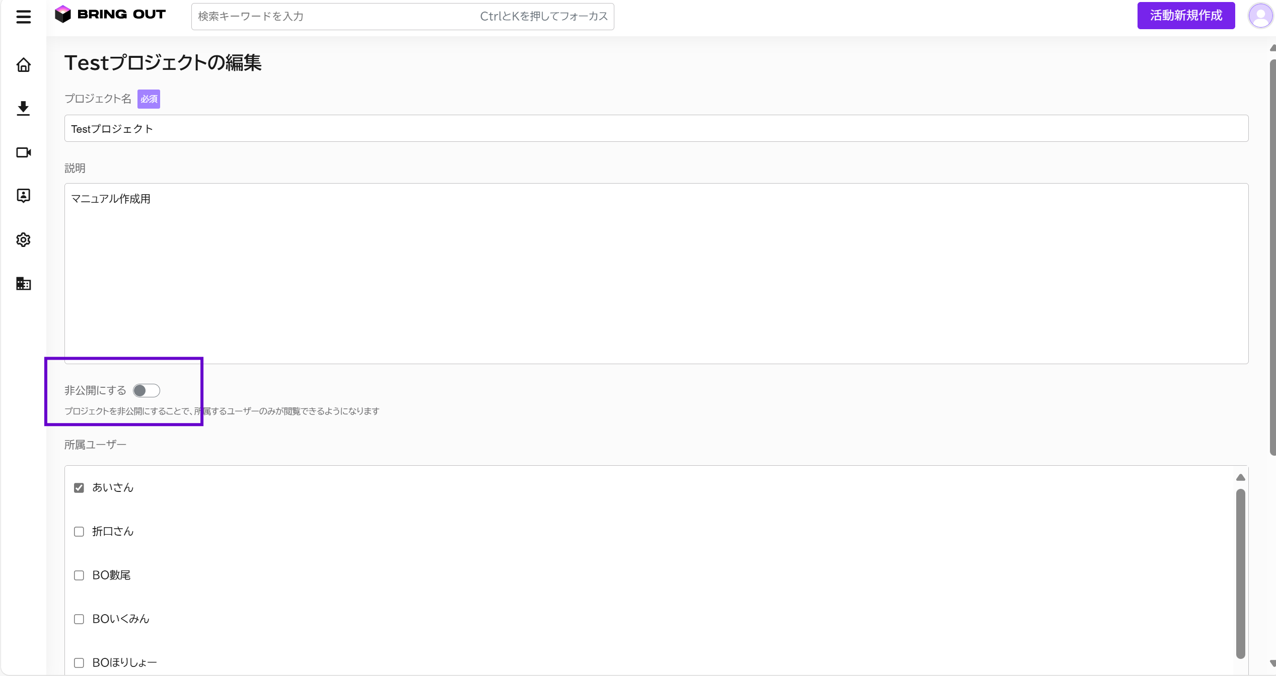 もし、「非公開」プロジェクトに切り替えをしたい場合は、「非公開にする」のトグルをクリックし、所属させるユーザーを選択してから「保存」をクリックします。