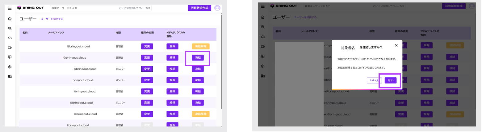 確認のダイアログが表示されるので、問題なければ「はい」をクリックします。凍結状態となり、アカウントの利用が停止されます。