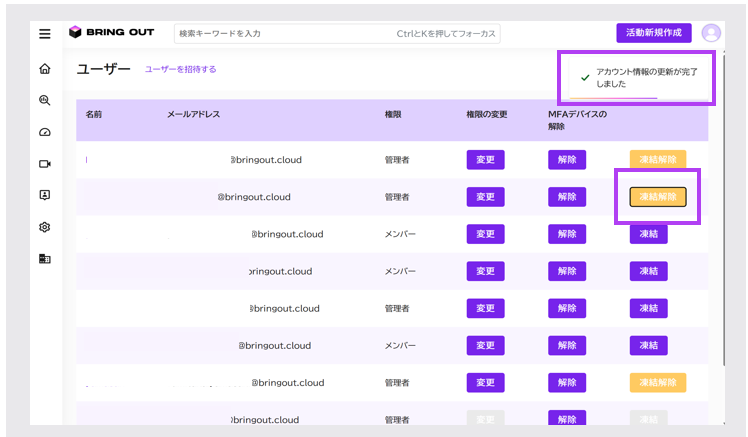 凍結されたユーザーには「凍結解除」のボタンが表示されます。必要に応じてこのボタンを押すことで、元の状態に戻すことも可能です。また、ログイン中のユーザーを凍結した場合でも、1時間後には自動的にログアウトします。