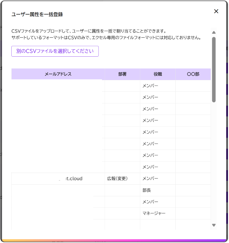 ファイルには現在の登録情報が反映されています。変更したいユーザーの属性を直接入力し、上書き保存をします。その後、「属性を一括登録」をクリックします。