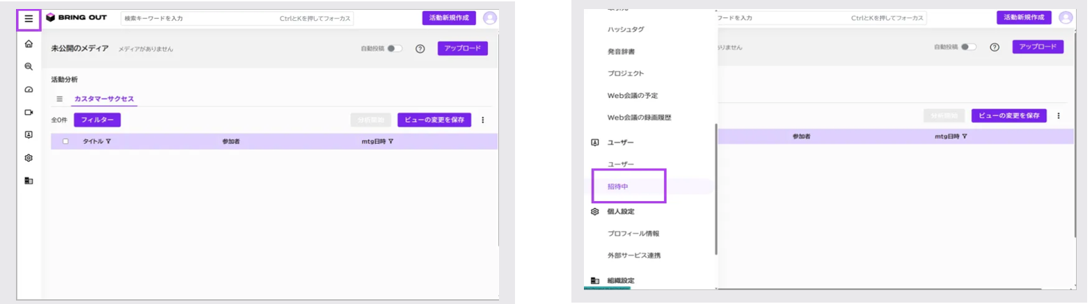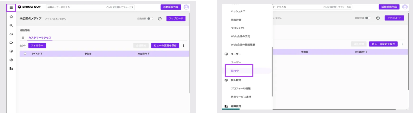 TOP画面左上の「≡メニュー」から「招待中」を選択します。