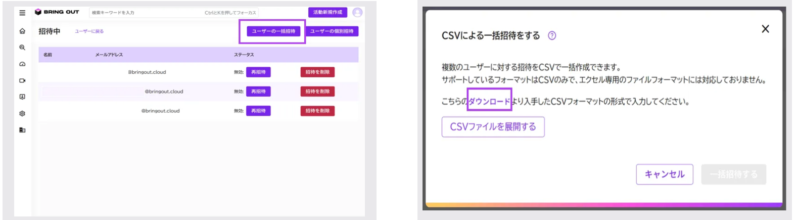 「ユーザーの一括招待」ボタンをクリックします。「ダウンロード」から、CSVのフォーマットをダウンロードしてください。