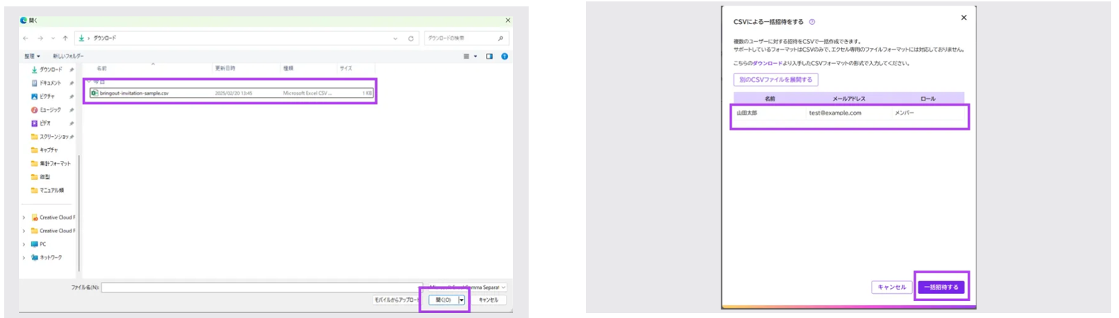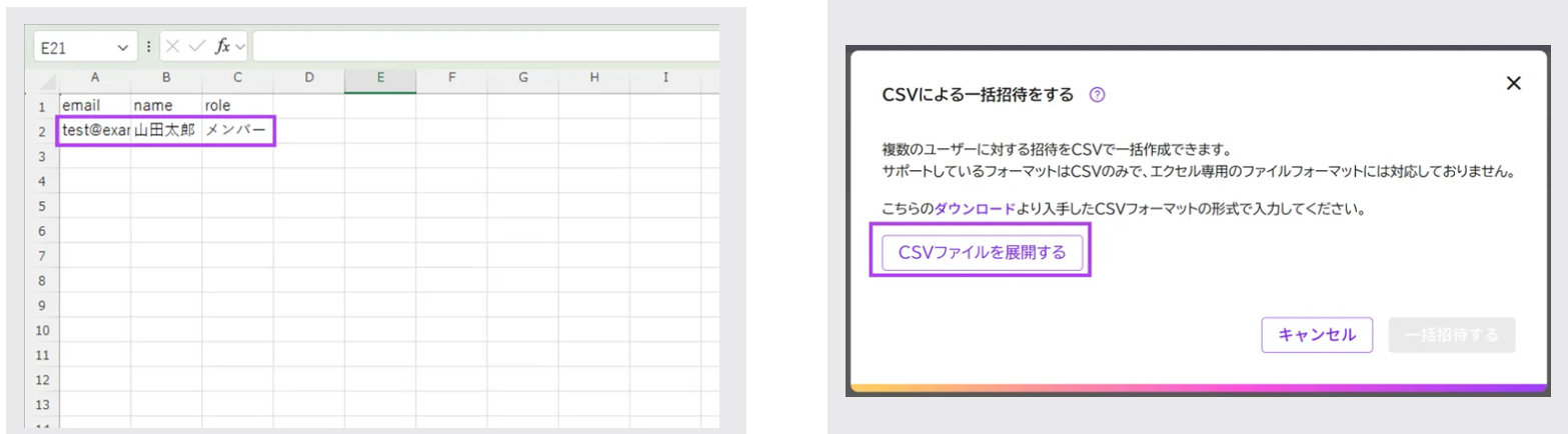 「メールアドレス」「名前」「付与する権限」の3点を記入し、PC上に保存後、「CSVファイルを展開する」をクリックします。