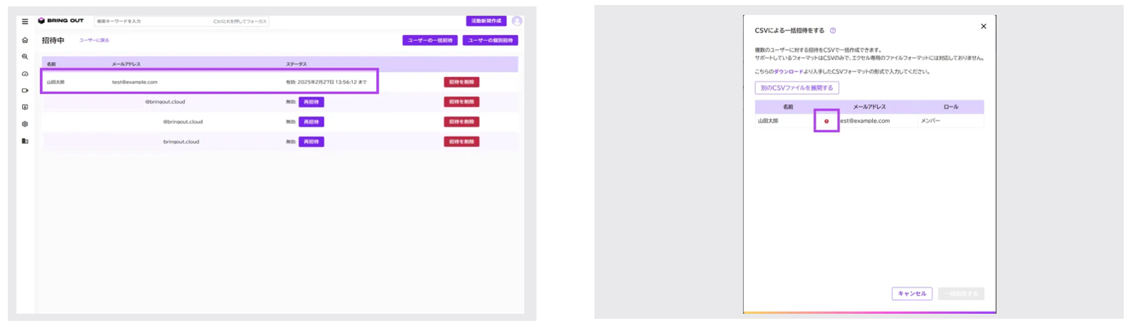 読み込まれた内容に誤りがないか確認し、問題なければ、「一括招待する」をクリックします。
