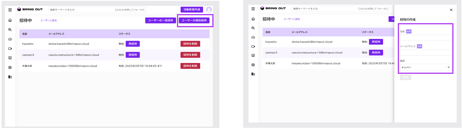 新規で登録される1名の方を招待します。招待メールが対象者に送信されます。