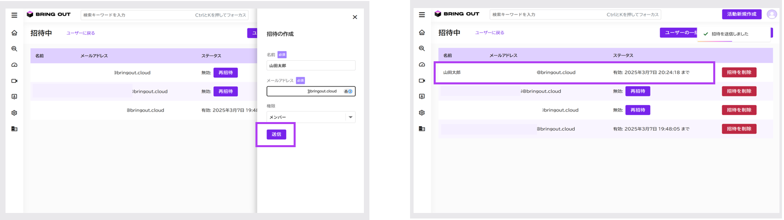 入力が完了したら「送信」をクリックします。招待が完了し、招待メールが対象者に自動的に送信されます。