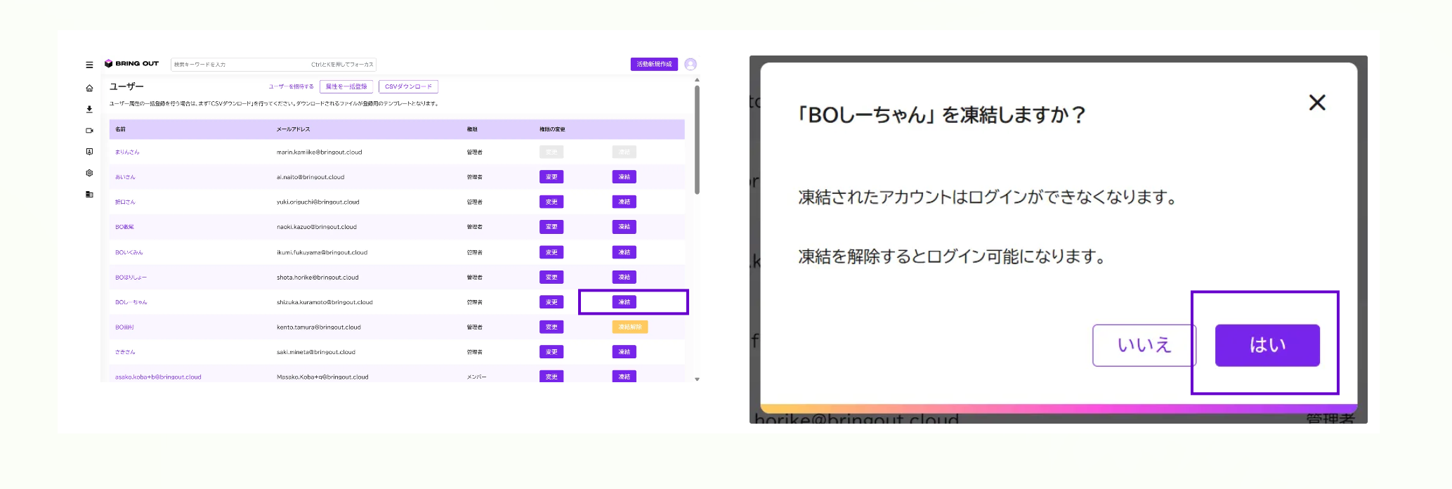 アカウントの削除(=凍結)対象のユーザーの右側にある「凍結」ボタンをクリックします。