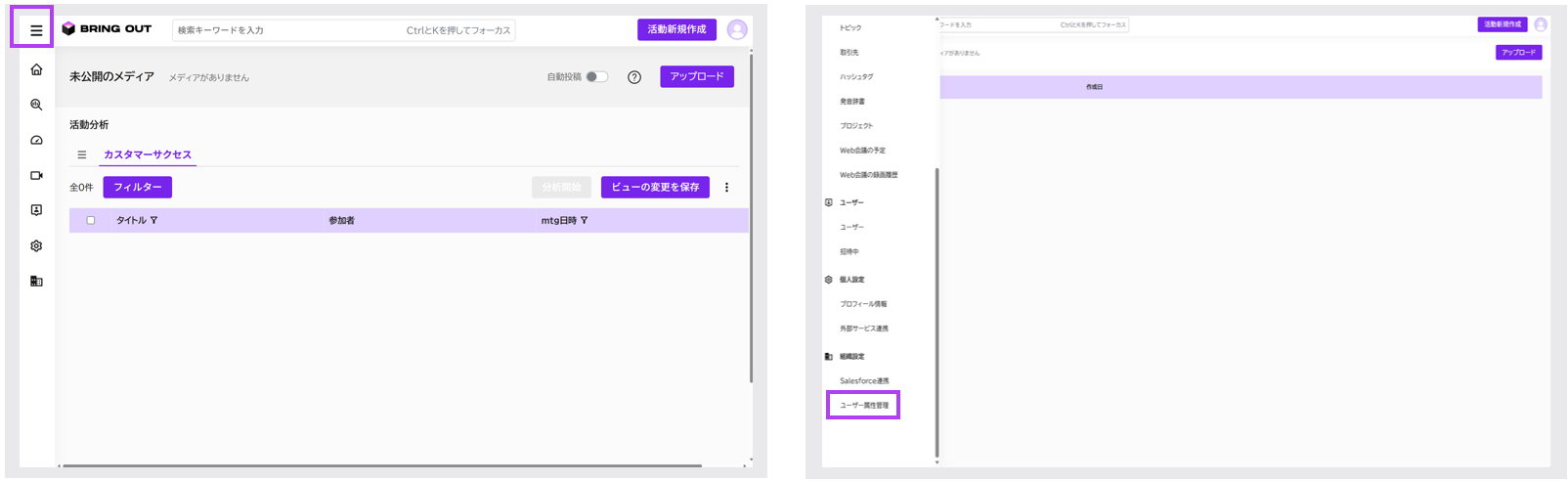 TOP画面左側の「≡メニュー」をクリックし、「ユーザー属性管理」を選択します。