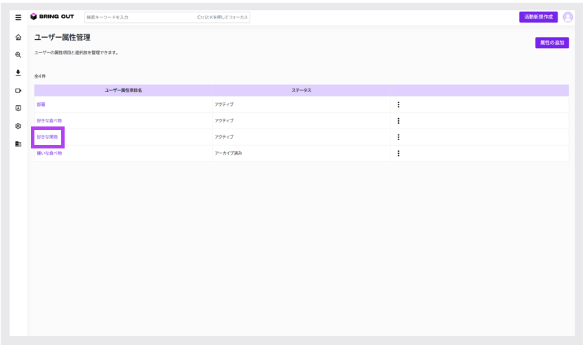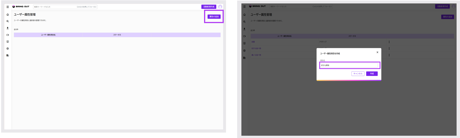 「属性の追加」を選択し、属性項目名を入力し「作成」をクリックします。