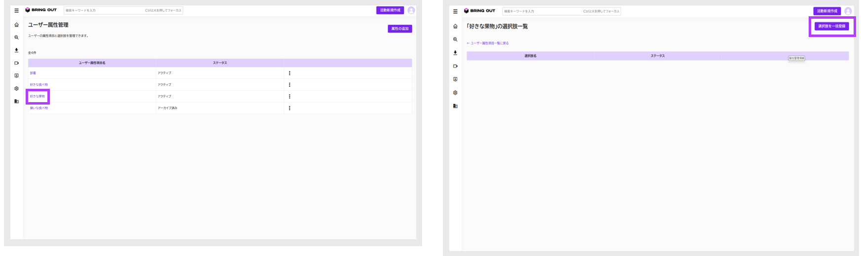 属性情報を選択し、「選択肢を一括登録」をクリックします。