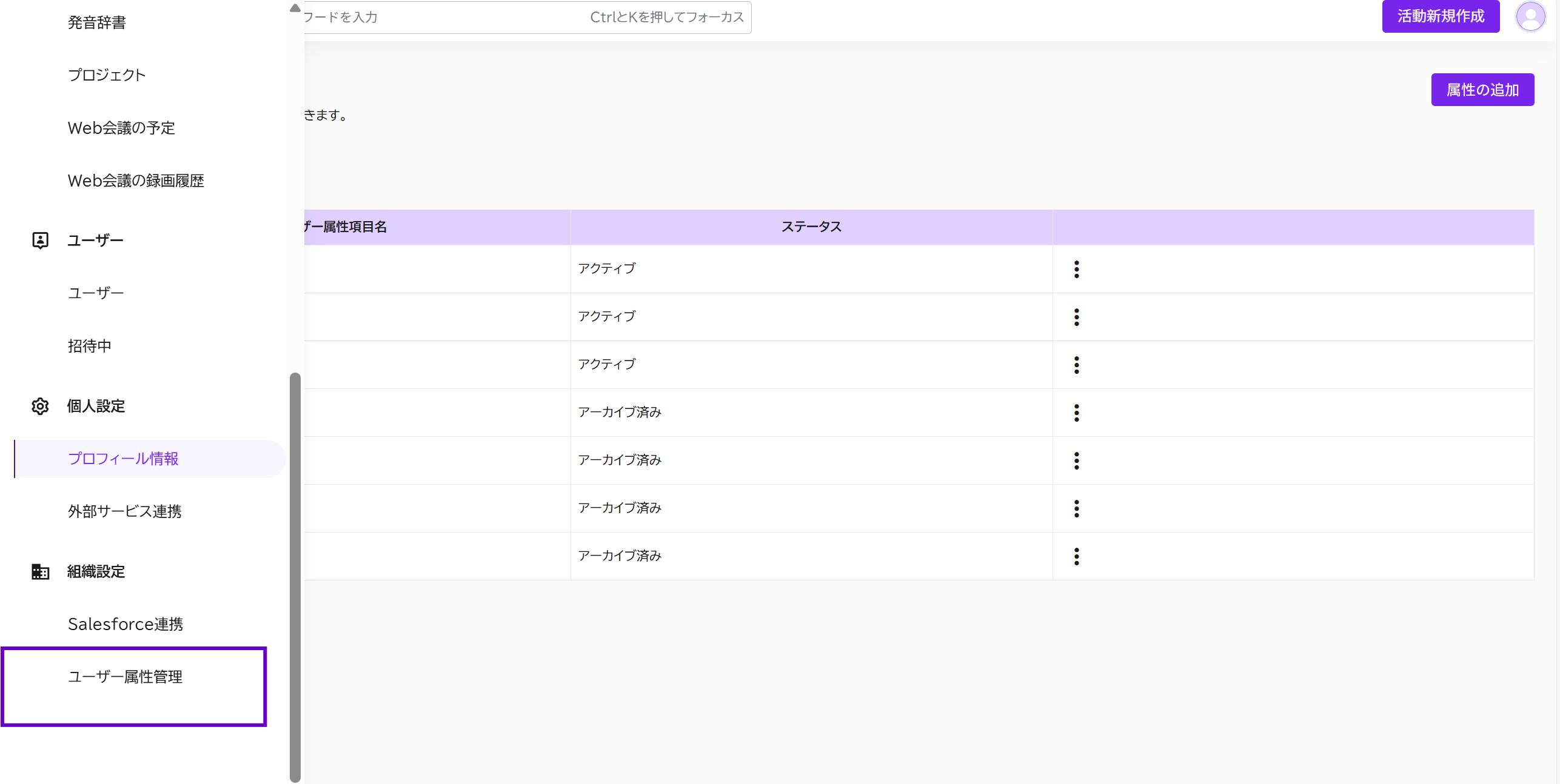 (すでに登録している選択肢は、「≡メニュー」の「ユーザー属性管理」から、「ユーザー属性項目名」をクリックすると確認できます。)