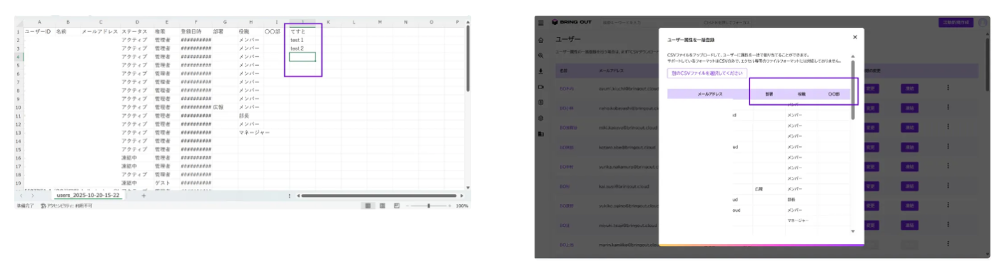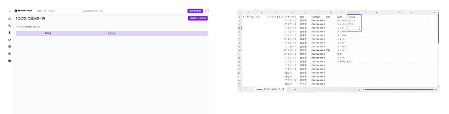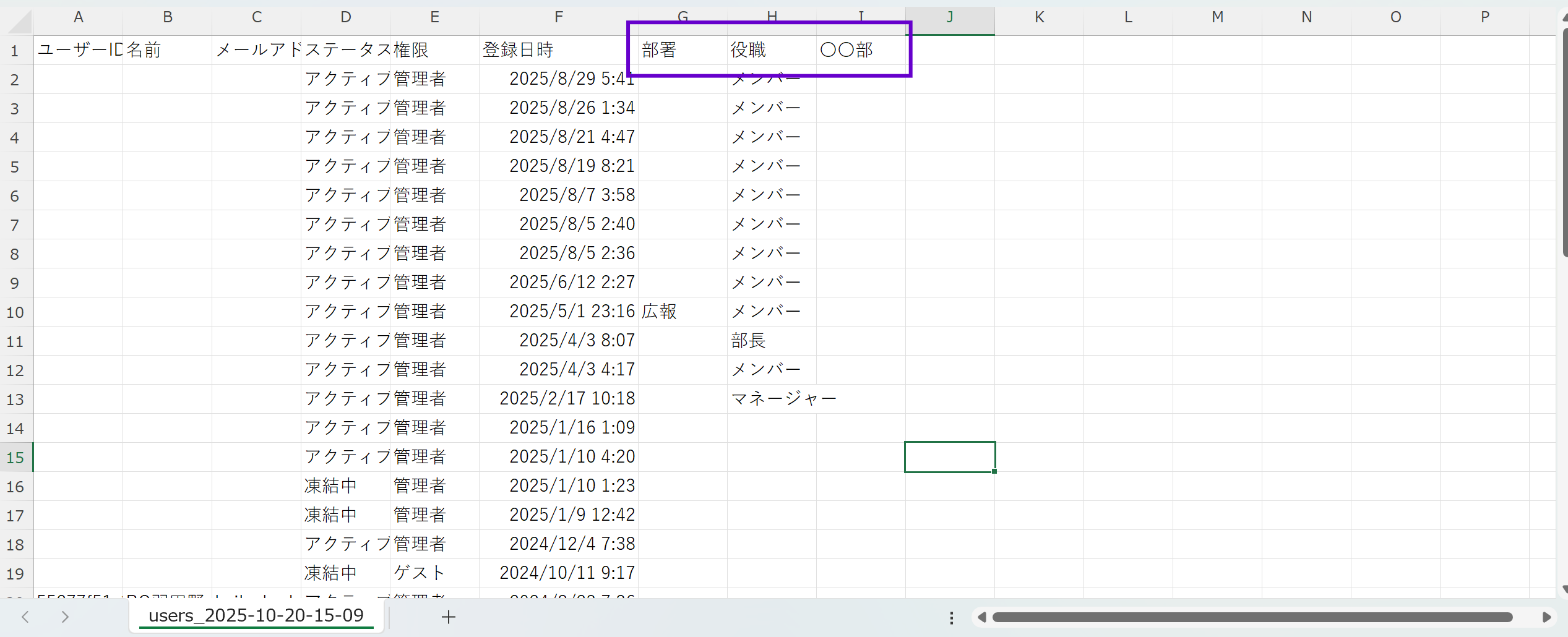 「ユーザー」からダウンロードしたCSVファイルには、「ユーザー属性管理」に登録されていて、且つ「アクティブ」になっている属性名が表示されます。