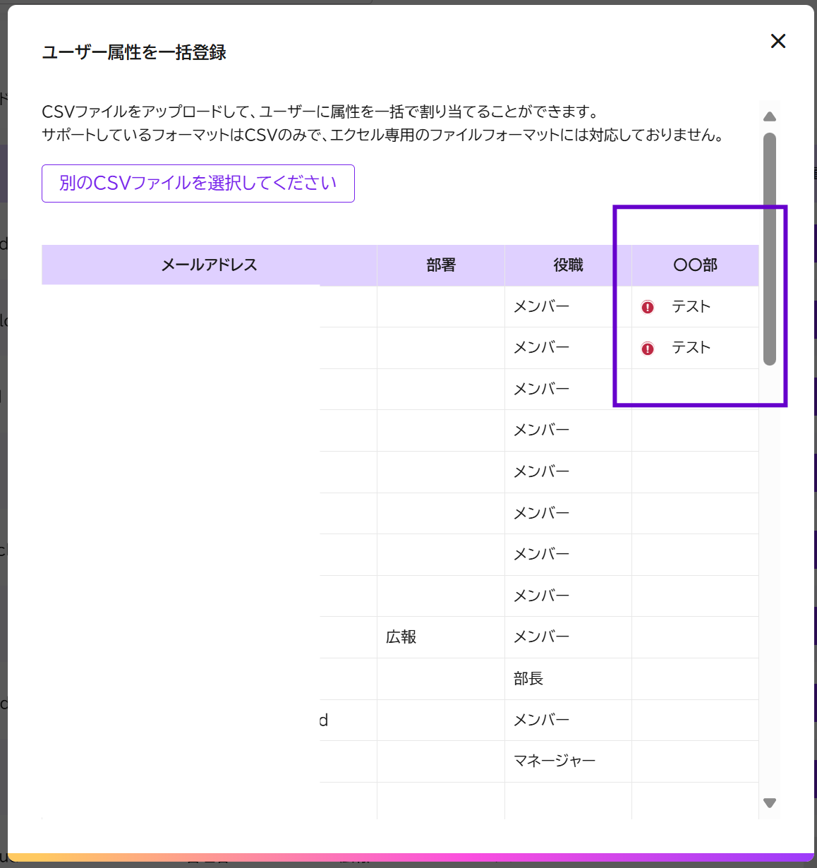未登録や非アクティブな属性名の場合は、先に登録、またはアクティブへの切り替えを実施後に、CSVファイルの登録をしてください。