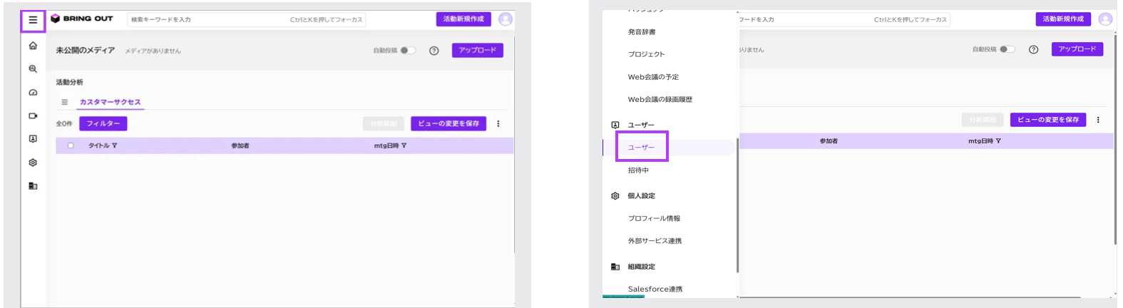 画面左上の「≡メニュー」から、「ユーザー」をクリックします。