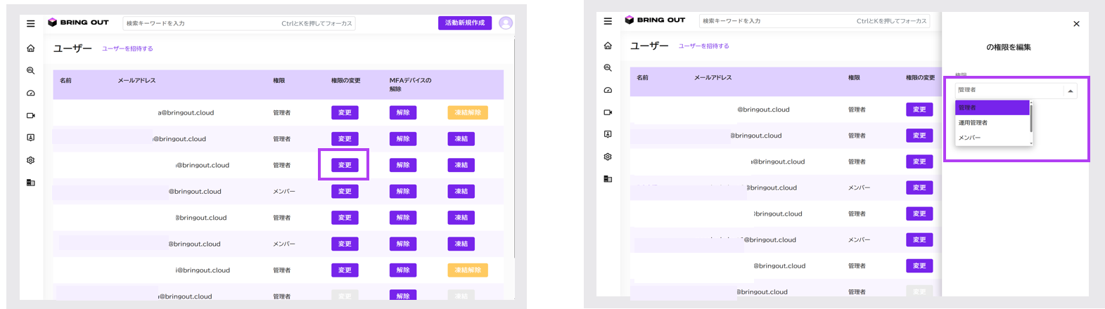 権限を変更したいユーザーの「変更」ボタンをクリックします。プルダウンから、付与したい新しい権限を選択します。