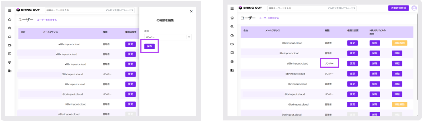 「保存」をクリックし、完了です。変更されたユーザーは次回ログイン時から、新しい権限での利用が可能です。