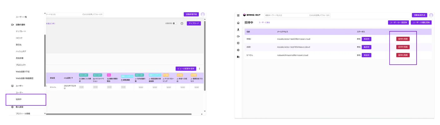 「≡メニュー」の、「招待中」を開き、招待を取り消ししたいユーザーの「招待を削除」をクリックします。