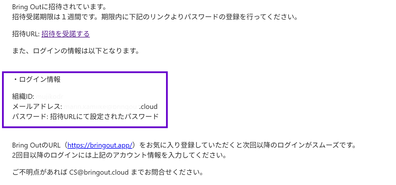 件名は「Bring Outへの招待のご案内 (7日以内にパスワードをご登録ください)」です。