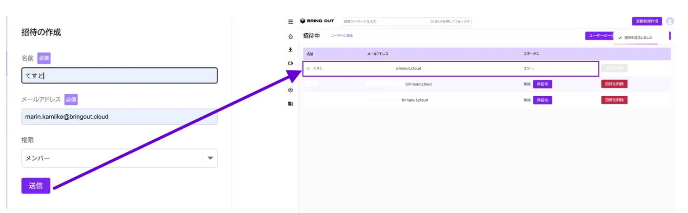 利用中のユーザーに招待を送ろうとした場合、登録情報を入力後「送信」をクリックすることはできますが、エラー表示になります。