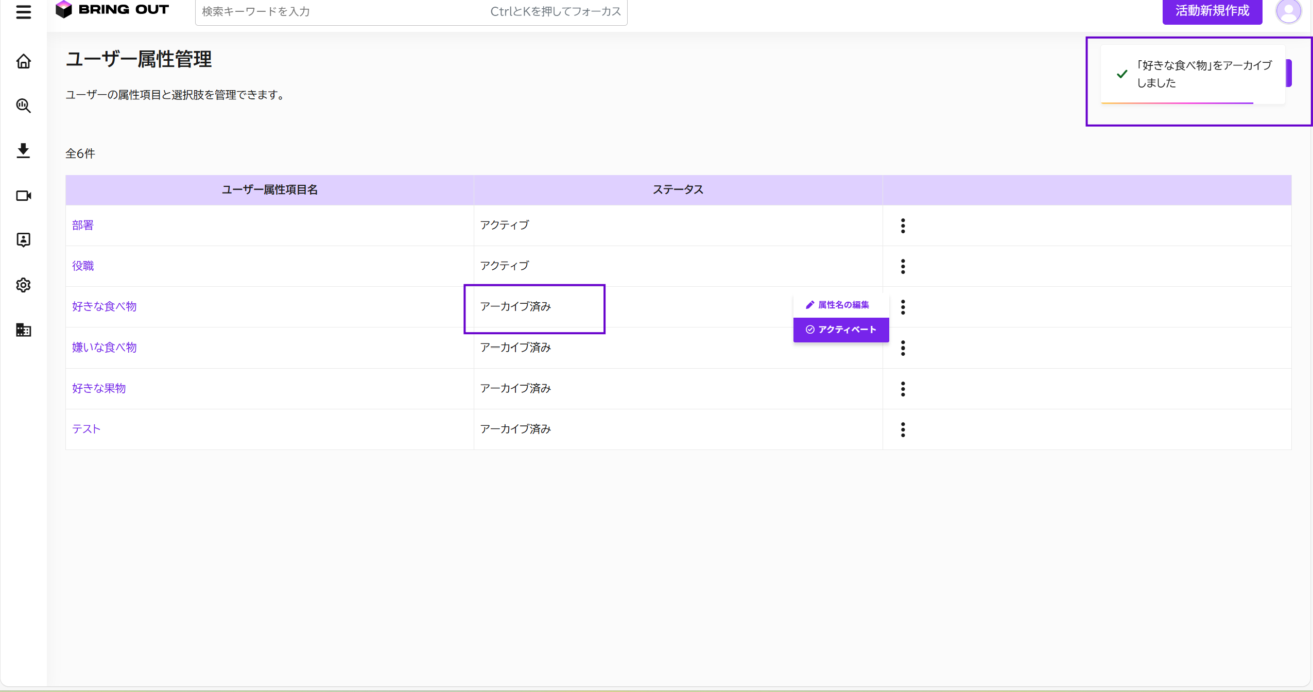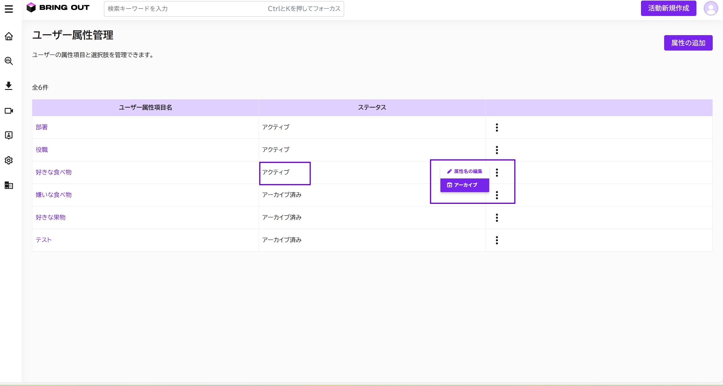 「アクティブ」になっている属性の中から、除外したい属性および選択肢の「︙マーク」をクリックし、「アーカイブ」をクリックします。