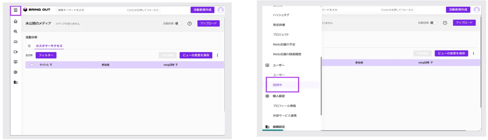 画面左上の「≡メニュー」から「招待中」をクリックします。